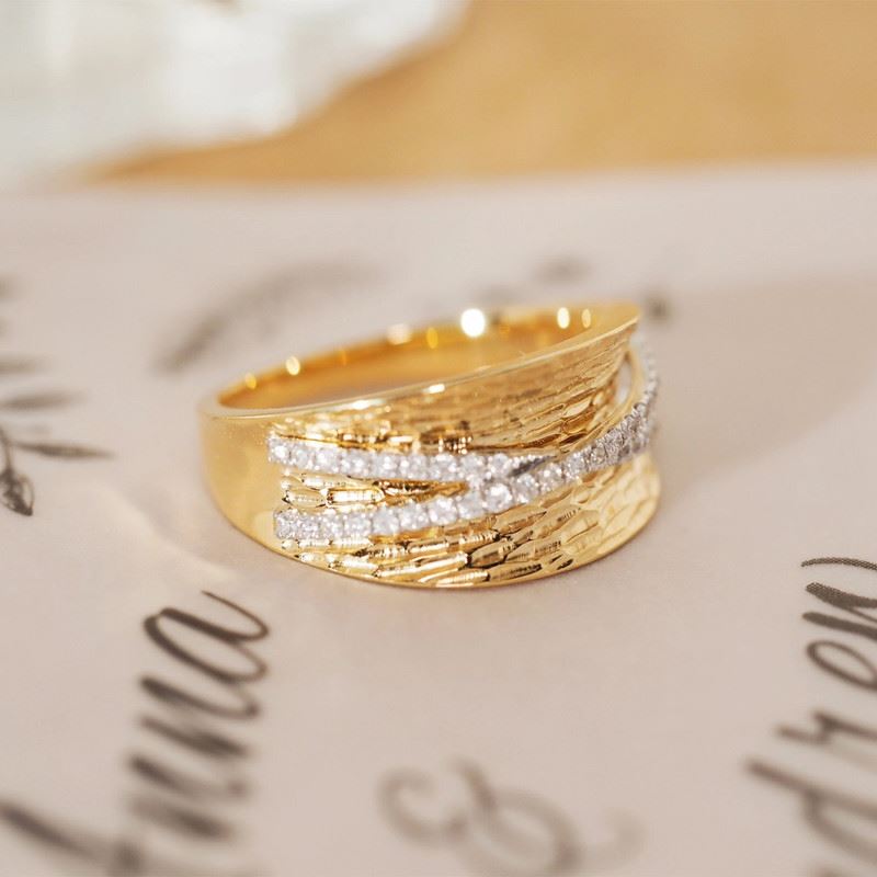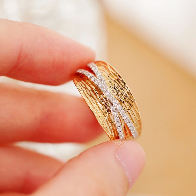 This 18K gold hammered cross diamond ring showcases exquisite craftsmanship with its textured hammered finish. Two diamond-studded curves intertwine gracefully, symbolizing the harmony of elegance and strength. The warm glow of the gold complements the brilliance of the diamonds, creating a perfect balance. Ideal for both daily wear and formal occasions, this ring radiates sophistication and refined taste.Ring size: 6, circumference: 52 mm, diameter: 16.6 mm, total weight: 6.17g.Note: GUILD certificate, comes with a jewelry, gemstone, and precious metal authentication certificate.