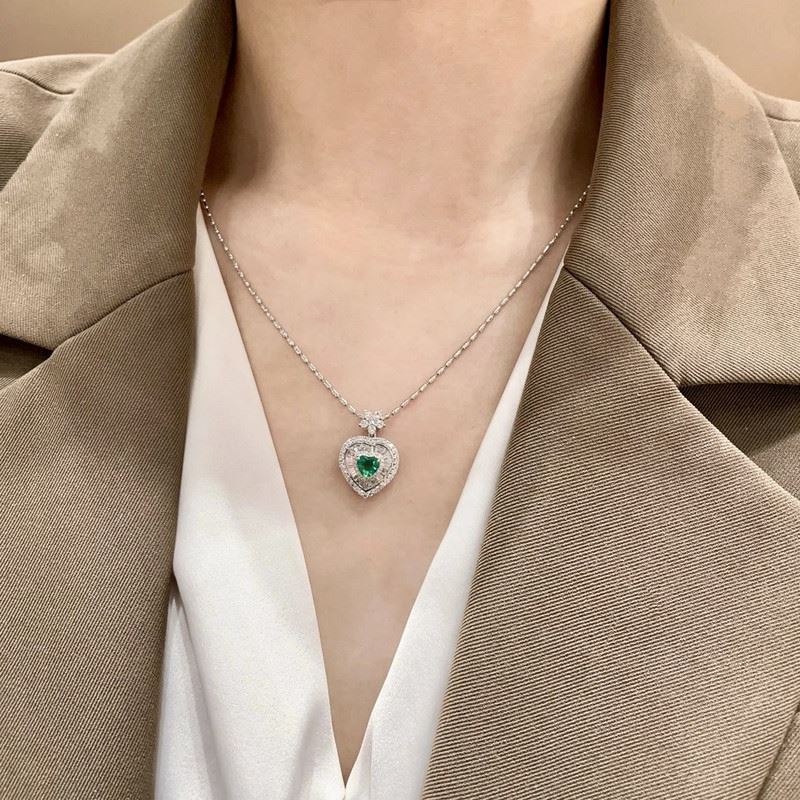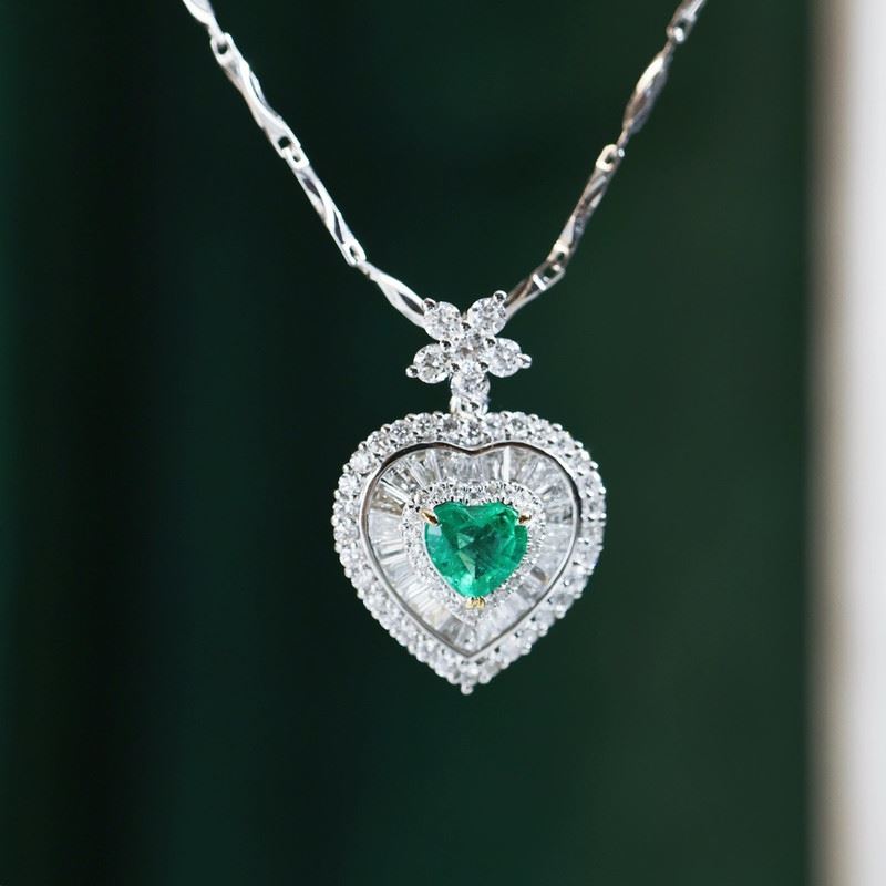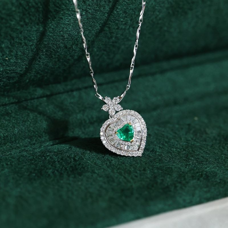 This 18K gold pendant features a heart-shaped emerald surrounded by baguette and round-cut diamonds for a brilliant effect. The floral diamond accent adds delicate charm, symbolizing pure love and timeless elegance.Total weight: 2.04g.Note: GUILD certificate, comes with a jewelry, gemstone, and precious metal authentication certificate.