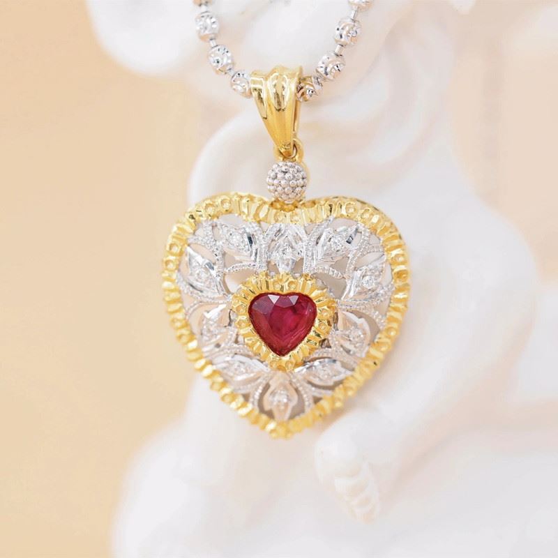 This 18K gold pendant features a heart-shaped design with a vivid ruby at its center, surrounded by intricate gold filigree and diamond-accented leaf motifs. The blend of fiery red and rich gold radiates luxury and symbolizes deep, everlasting love.Total weight: 3.39g.Note: GUILD certificate, comes with a jewelry, gemstone, and precious metal authentication certificate.