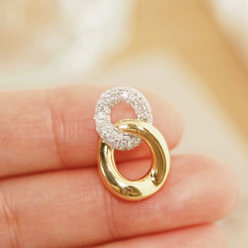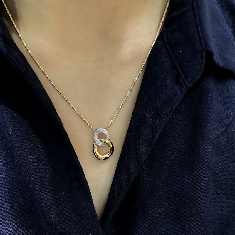 This 18K gold pendant features two interlocking rings in gold and white tones, symbolizing eternity and unity. Its sleek, minimalist design exudes modern sophistication, making it perfect for everyday elegance.Total weight: 4.06g.Note: GUILD certificate, comes with a jewelry, gemstone, and precious metal authentication certificate.