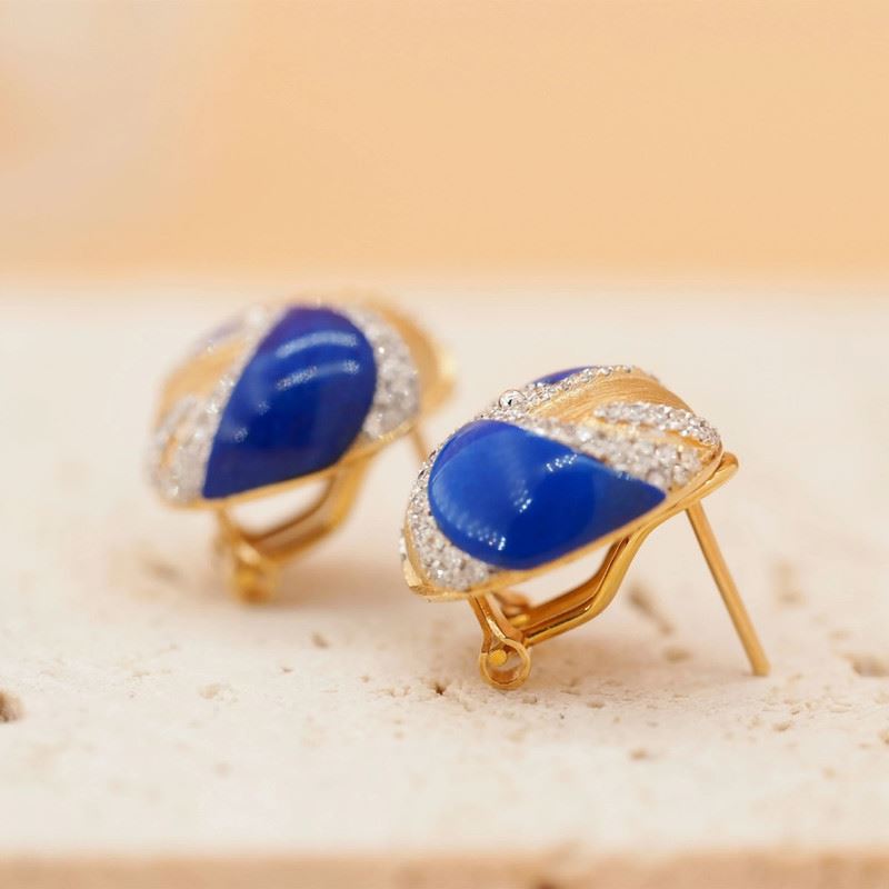 These 18K gold earrings feature lapis lazuli stones, whose deep blue hue complements the gold’s warm shine. The elegant design, combined with the natural color of the lapis lazuli, perfectly blends luxury with nature.Total weight: 7.98g.Note: GUILD certificate, comes with a jewelry, gemstone, and precious metal authentication certificate.