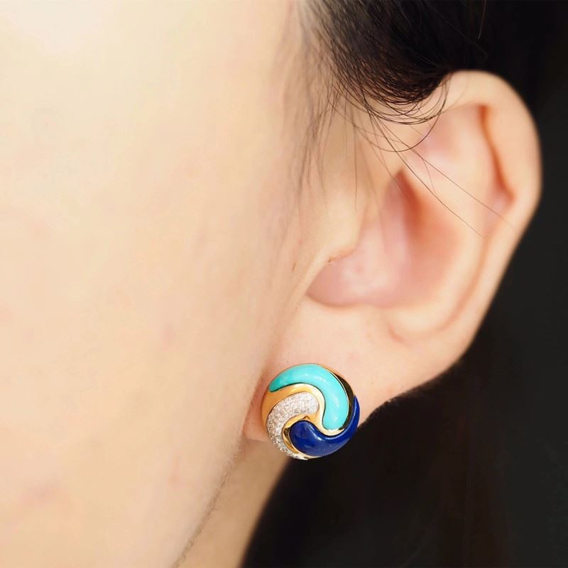 Crafted in 18K gold, these earrings feature natural lapis lazuli and turquoise gemstones, inspired by the harmonious colors of nature. The flowing curves of the design are paired with sparkling diamonds, creating a perfect blend of modern and traditional aesthetics. Each gemstone is carefully set, adding an elegant and refined touch.Total weight: 7.56g.Note: GUILD certificate, comes with a jewelry, gemstone, and precious metal authentication certificate.