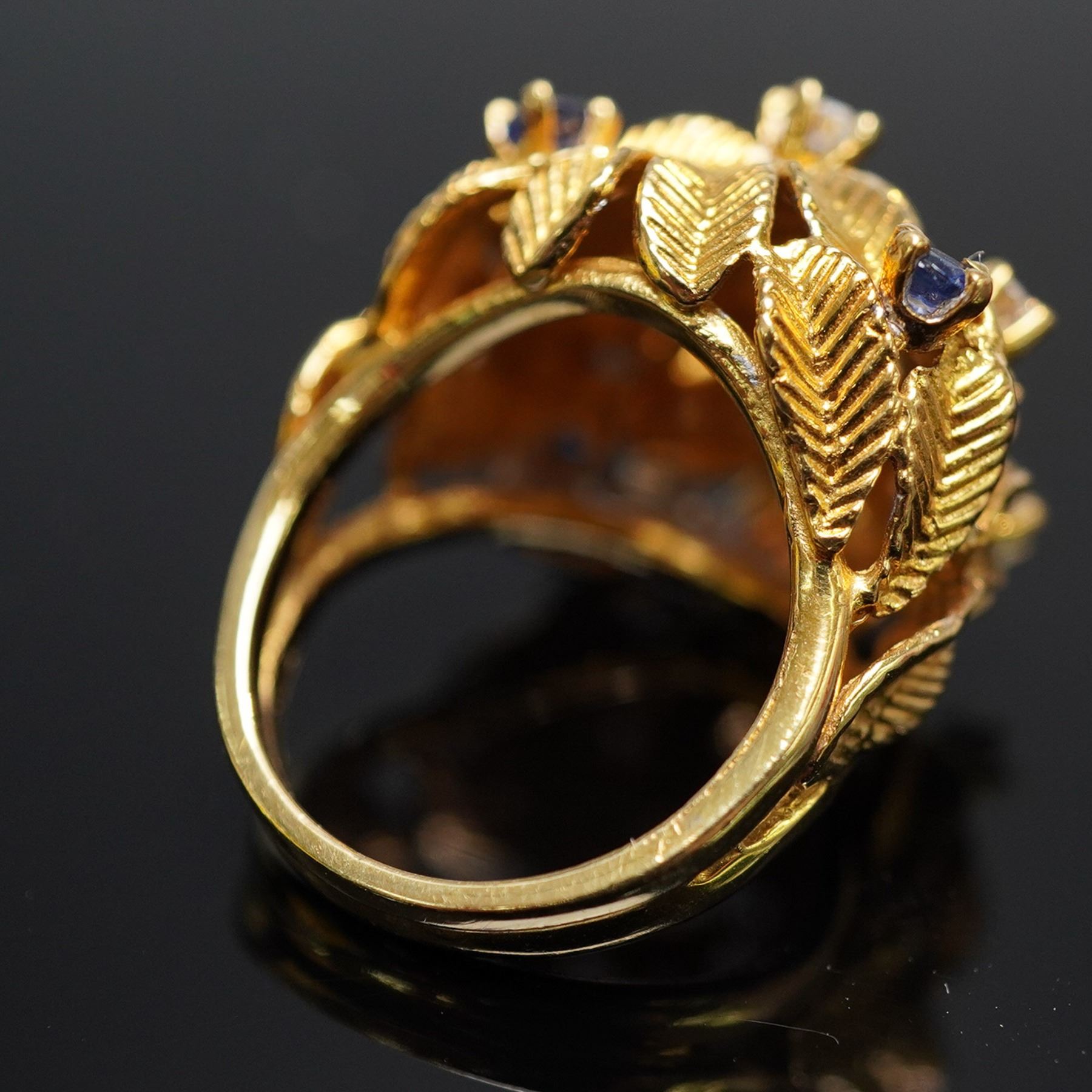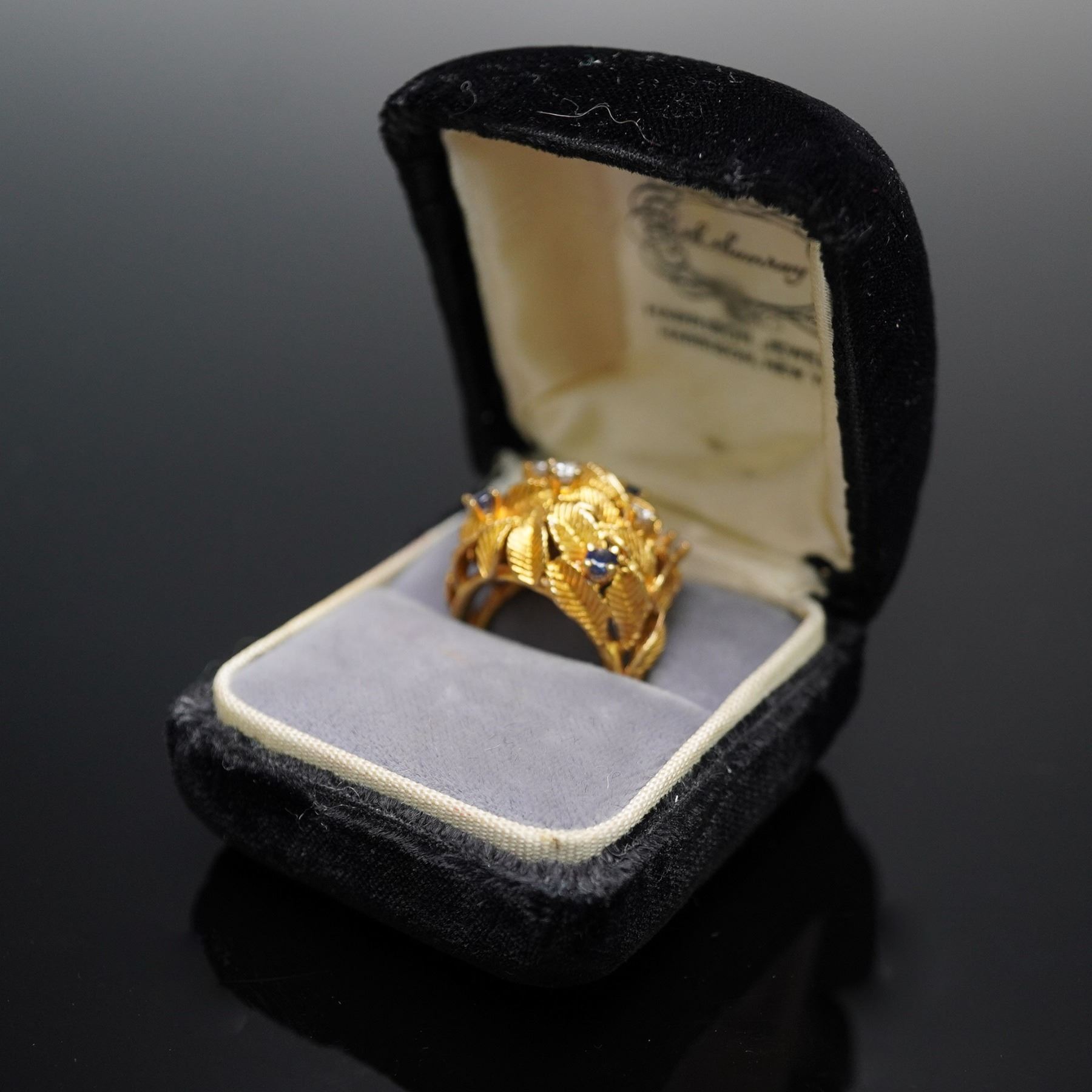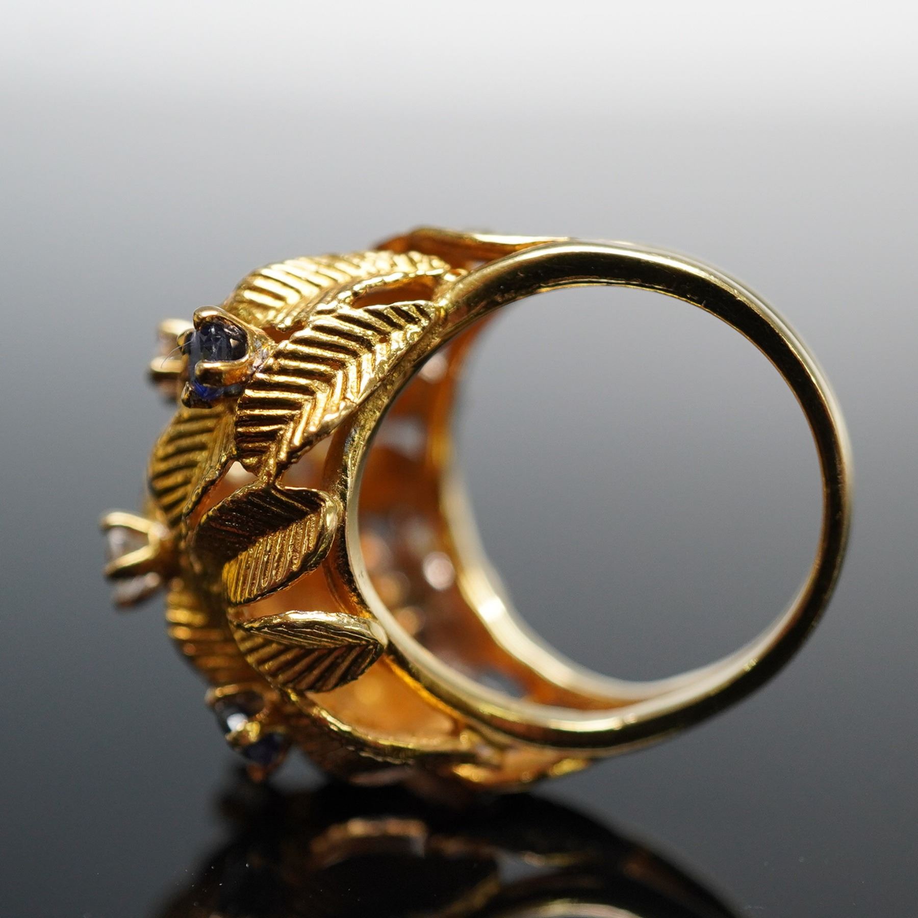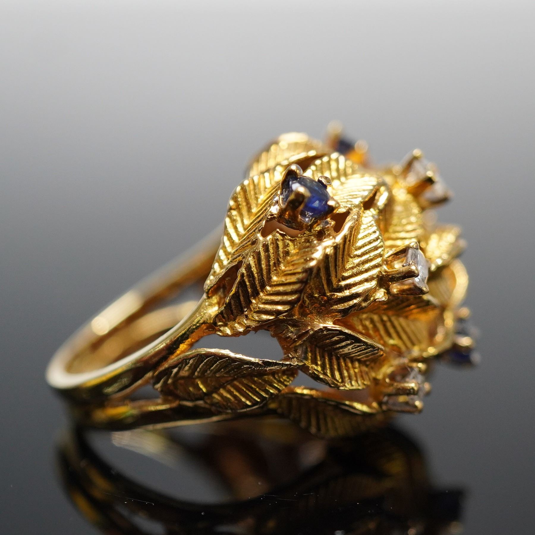Vintage 18K yellow gold ring featuring an elaborate openwork leaf motif adorned with alternating round cut blue sapphires and white diamonds. The deeply textured leaves create a sculptural, nature-inspired design that wraps around the finger with dimensional elegance. The diamonds are estimated to be SI1 clarity, with a total weight of approximately 0.25 carats. Stones are prong set throughout the top of the band, offering brilliant contrast against the rich gold tone. The interior of the band is marked 18K. Includes vintage presentation box. Approx. weight: 8g.