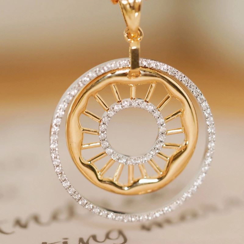 This 18K gold pendant is inspired by the form of a lotus root, featuring a layered circular design adorned with diamonds inside and out. The interplay of gold and sparkle creates a luminous harmony, symbolizing completeness and good fortune.Total weight: 5.13g.