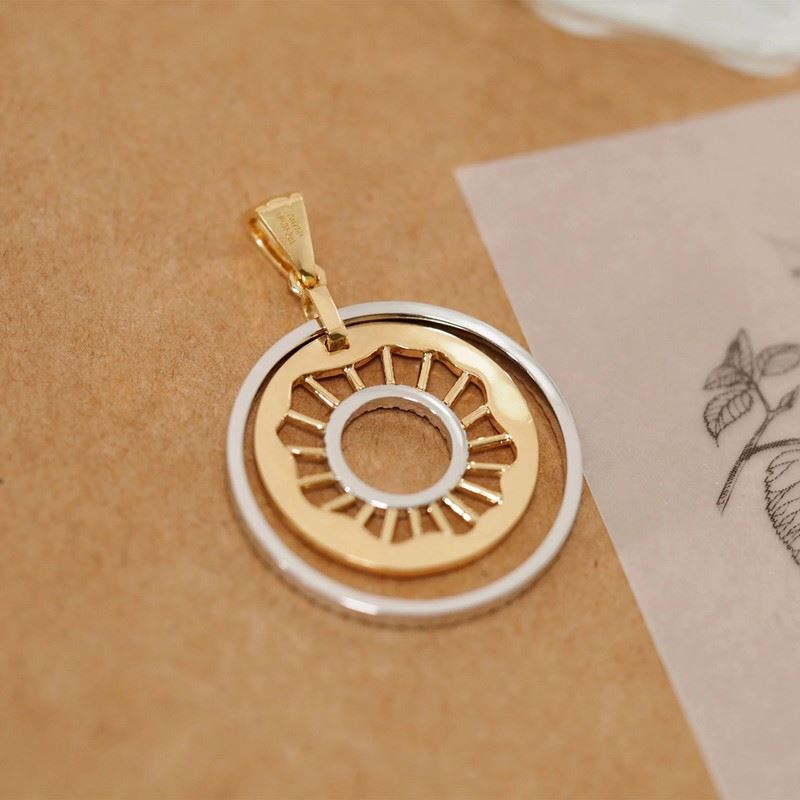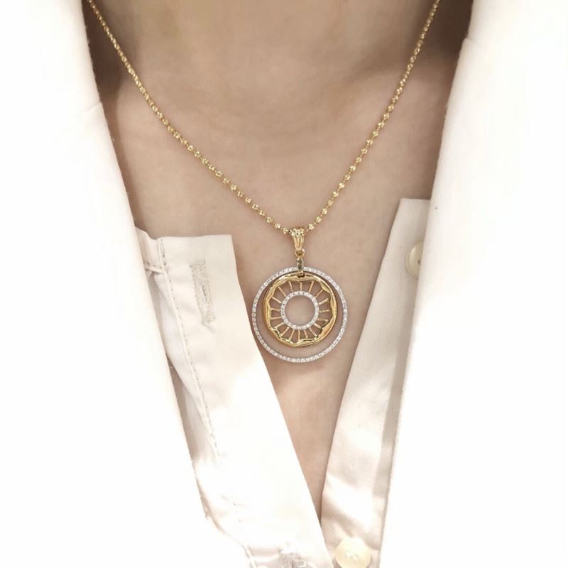 This 18K gold pendant is inspired by the form of a lotus root, featuring a layered circular design adorned with diamonds inside and out. The interplay of gold and sparkle creates a luminous harmony, symbolizing completeness and good fortune.Total weight: 5.13g.Note: GUILD certificate, comes with a jewelry, gemstone, and precious metal authentication certificate.