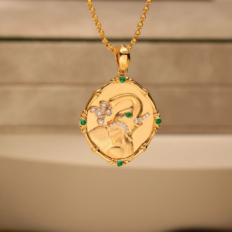 This 18K gold pendant features an elegant elephant motif, symbolizing good fortune and wisdom. Accented with green gemstones along the border, its warm golden tone and graceful design evoke a refined sense of oriental charm and artistry.Total weight: 6.92g.Note: GUILD certificate, comes with a jewelry, gemstone, and precious metal authentication certificate.