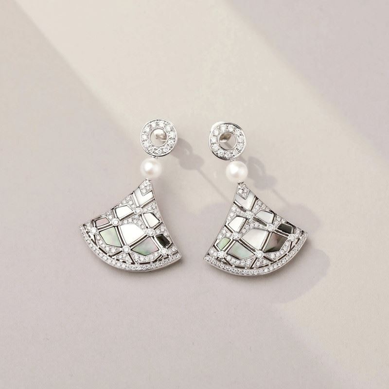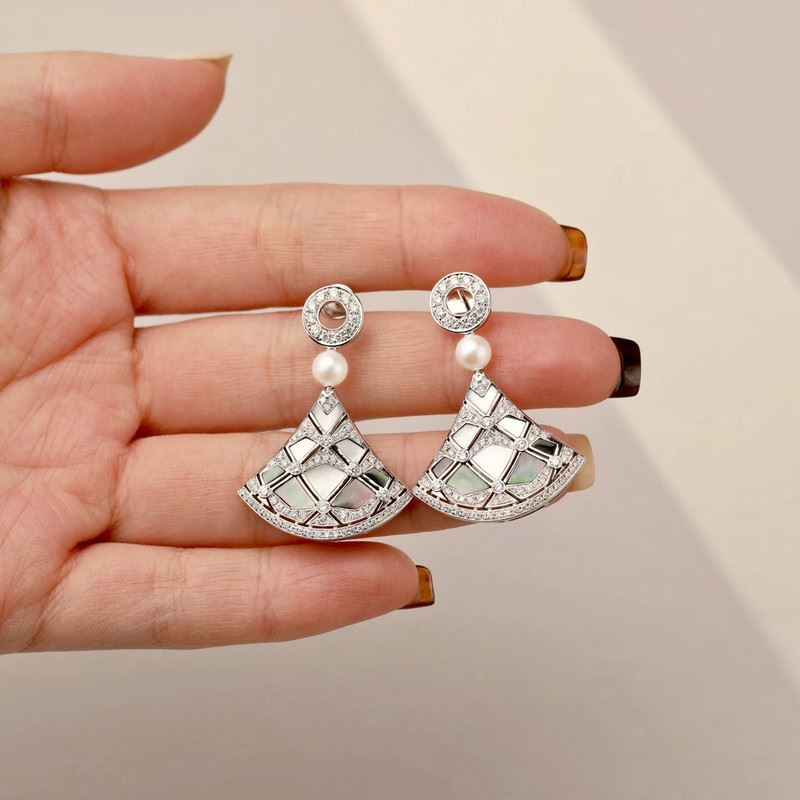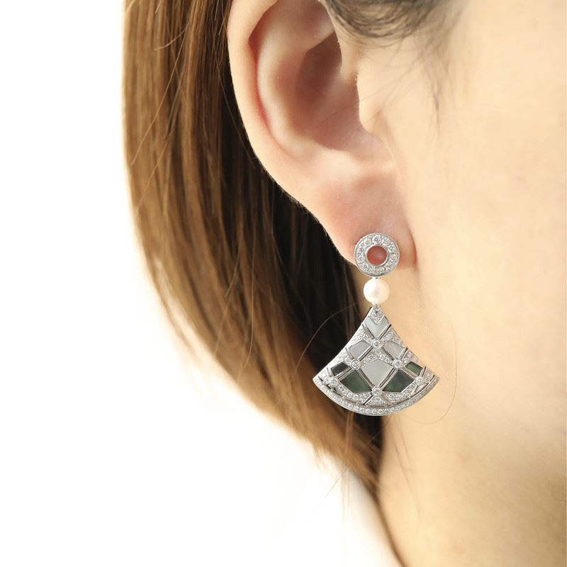 These 18K gold earrings feature a fan-shaped design combining mother-of-pearl and pearls. The natural luster of the mother-of-pearl shines harmoniously with the brilliance of diamonds, creating a unique visual effect that exudes elegance and romance.Total weight: 12.64g.Note: GUILD certificate, comes with a jewelry, gemstone, and precious metal authentication certificate.