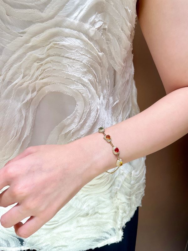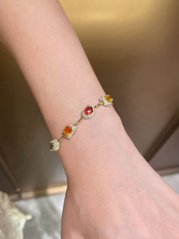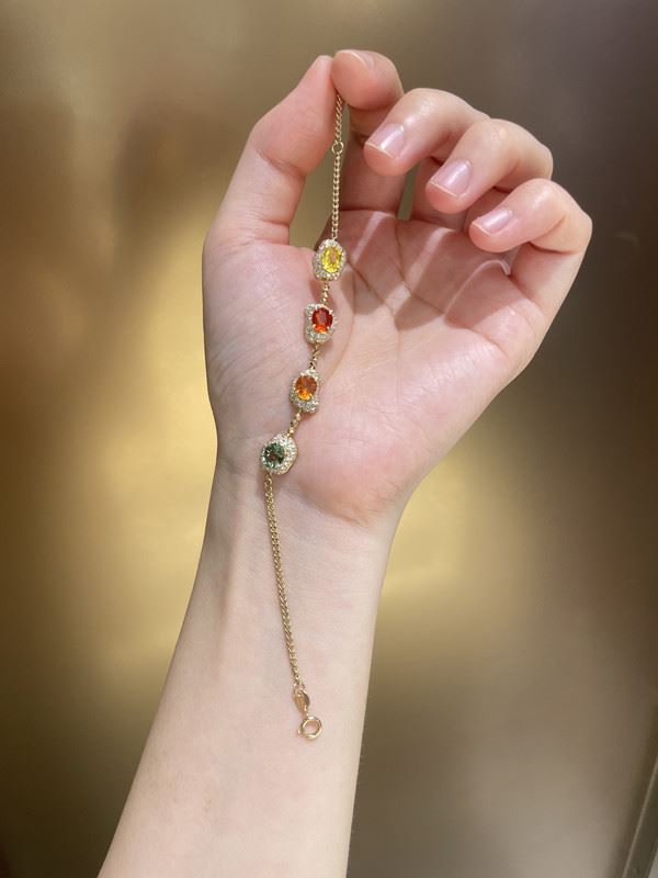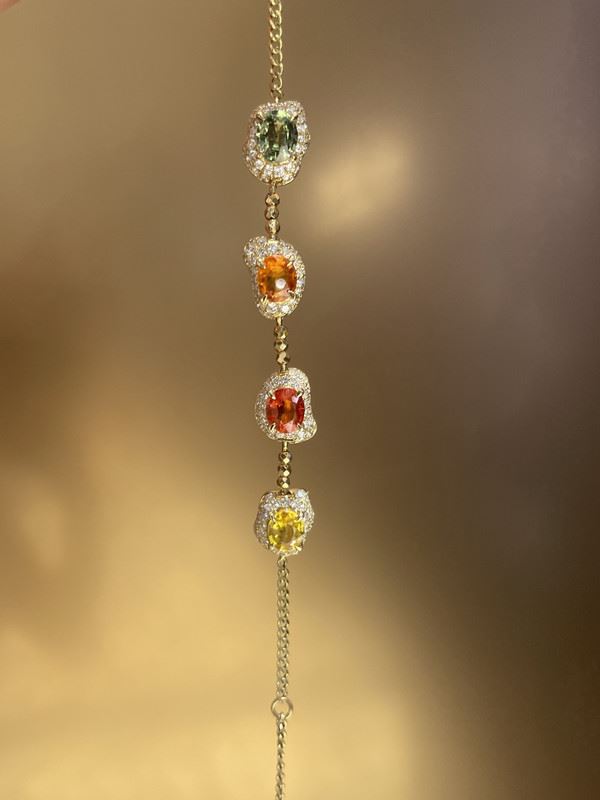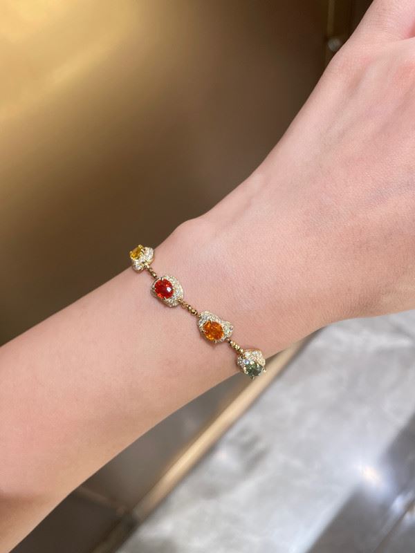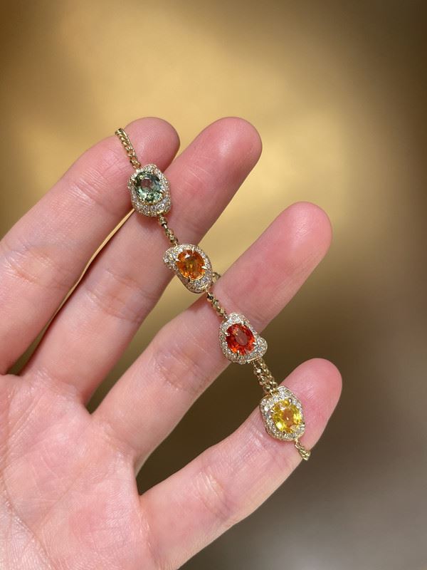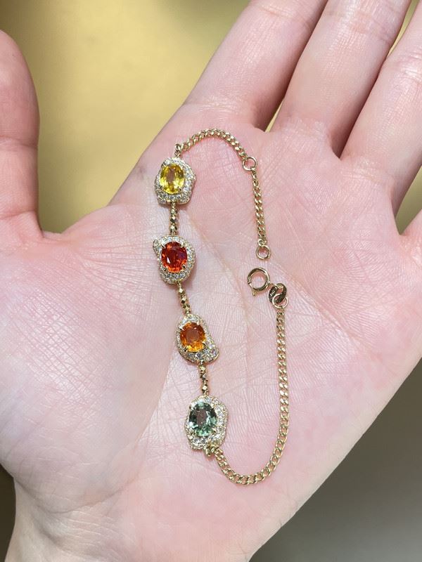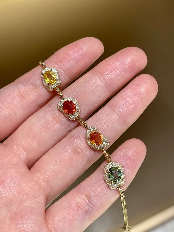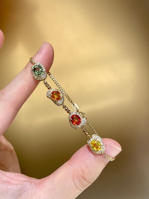 This 18K gold multicolor sapphire bracelet features four vibrant sapphires, each wrapped in delicate gold edges, creating a brilliant and layered effect. The simple yet elegant design, combined with the colorful stones, exudes both energy and luxury. It is perfect for various occasions, showcasing the wearer's unique charm.Total weight: 5.56g.Note: GUILD certificate, comes with a jewelry, gemstone, and precious metal authentication certificate.