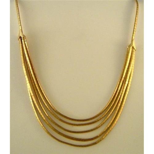 5 snake chains draped in front. The snake chains are 9 inches long. 35.7 gr. 23.0 dwt. Marked 18K. In excellent condition.</font>