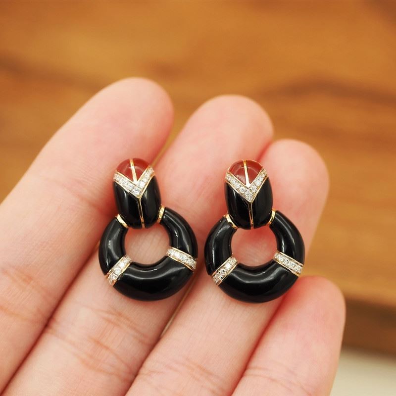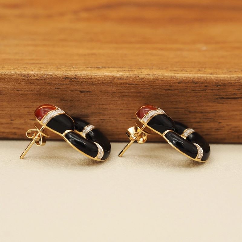 These 18K gold earrings combine smooth black onyx with exquisite diamond accents, showcasing a simple yet unique design style. The elegant lines and striking contrast make them a sophisticated fashion piece, perfect for various occasions.Total weight: 6.83g.Note: GUILD certificate, comes with a jewelry, gemstone, and precious metal authentication certificate.