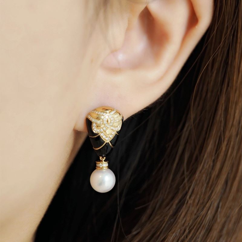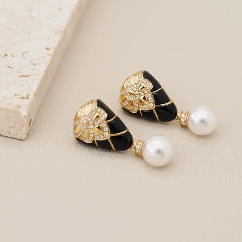 These 18K gold onyx pearl earrings feature a perfect combination of black onyx and lustrous pearls, with golden inlays and sparkling diamonds adding a luxurious touch. The unique design is both modern and classic, making it suitable for various occasions, showcasing the wearer’s noble taste.Total weight: 8.86g.Note: GUILD certificate, comes with a jewelry, gemstone, and precious metal authentication certificate.