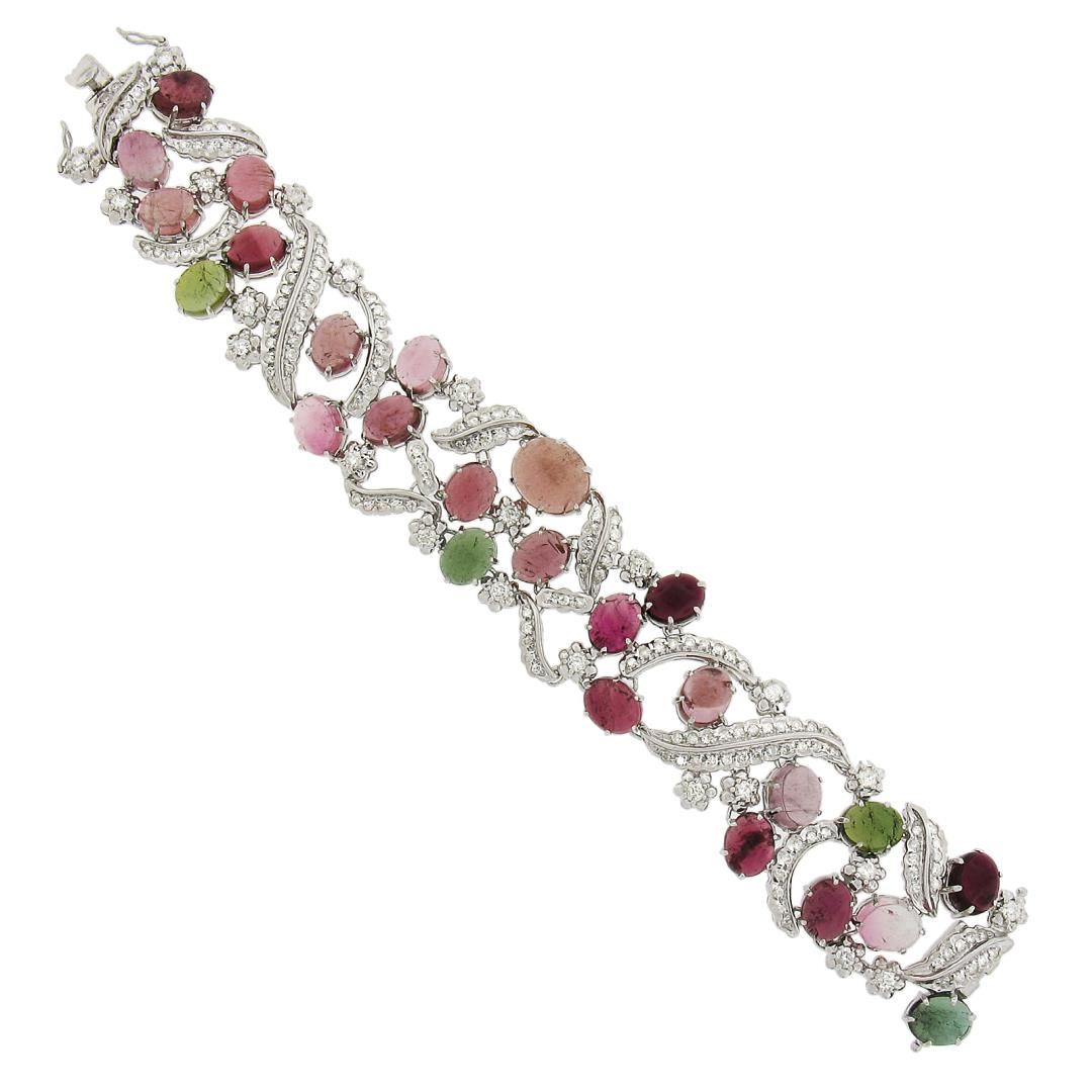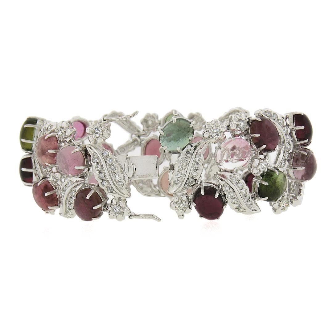18K Gold Oval Cabochon 49.55ctw Multi Color Tourmaline Diamond Wide Bracelet