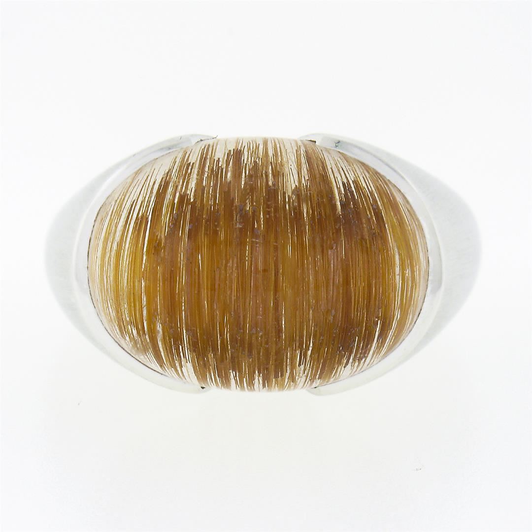 A solid 18k white gold solitaire ring, with 1 oval cabochon cut natural rutilated quartz (15x20mm). The ring is size 8.5, weighs a total of 19.95 grams, and measures 15.60mm wide.