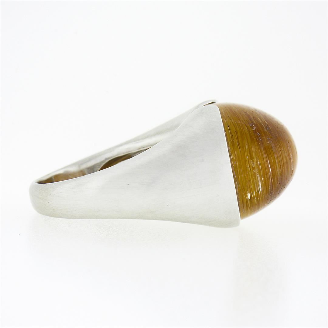 A solid 18k white gold solitaire ring, with 1 oval cabochon cut natural rutilated quartz (15x20mm). The ring is size 8.5, weighs a total of 19.95 grams, and measures 15.60mm wide.