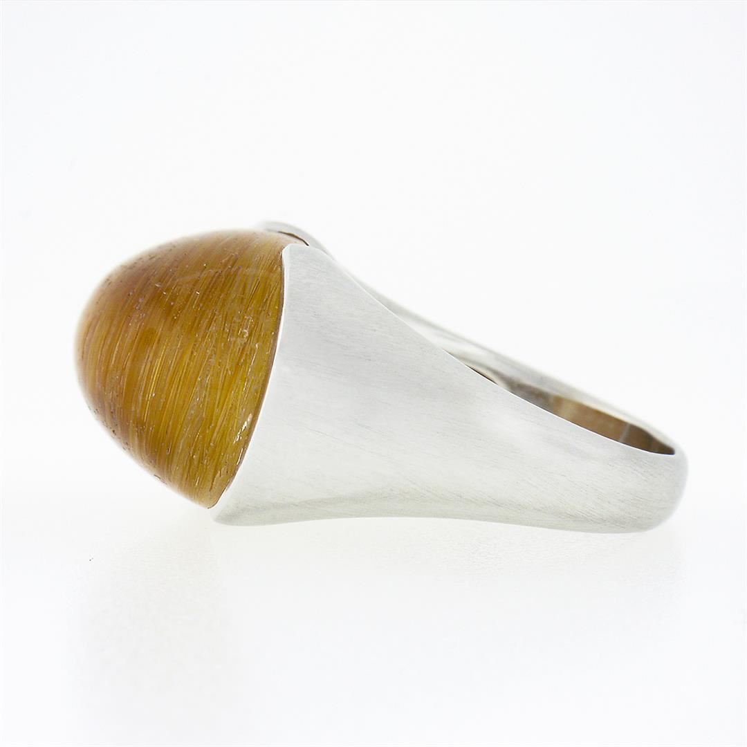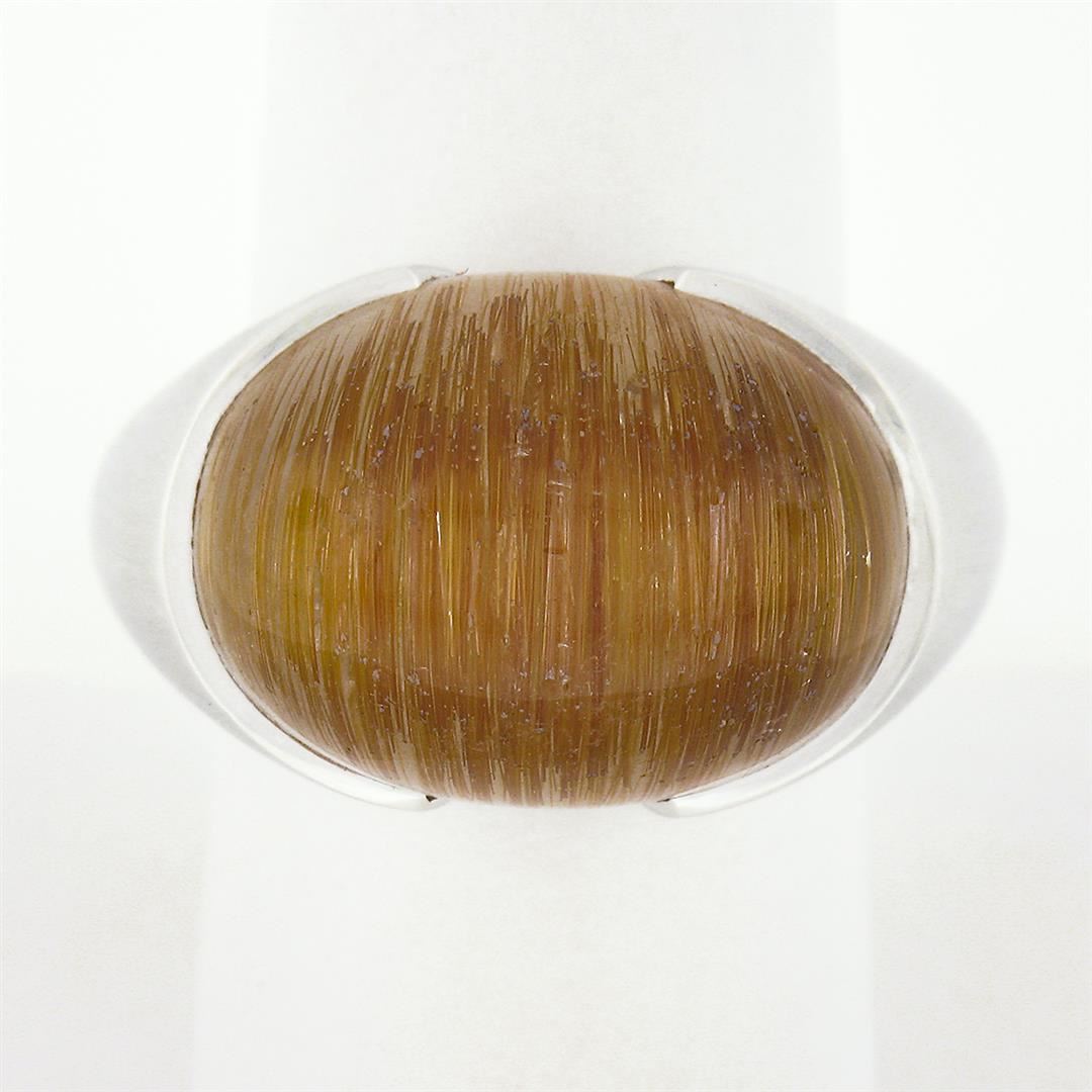 A solid 18k white gold solitaire ring, with 1 oval cabochon cut natural rutilated quartz (15x20mm). The ring is size 8.5, weighs a total of 19.95 grams, and measures 15.60mm wide.