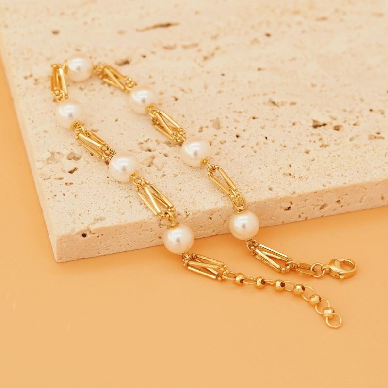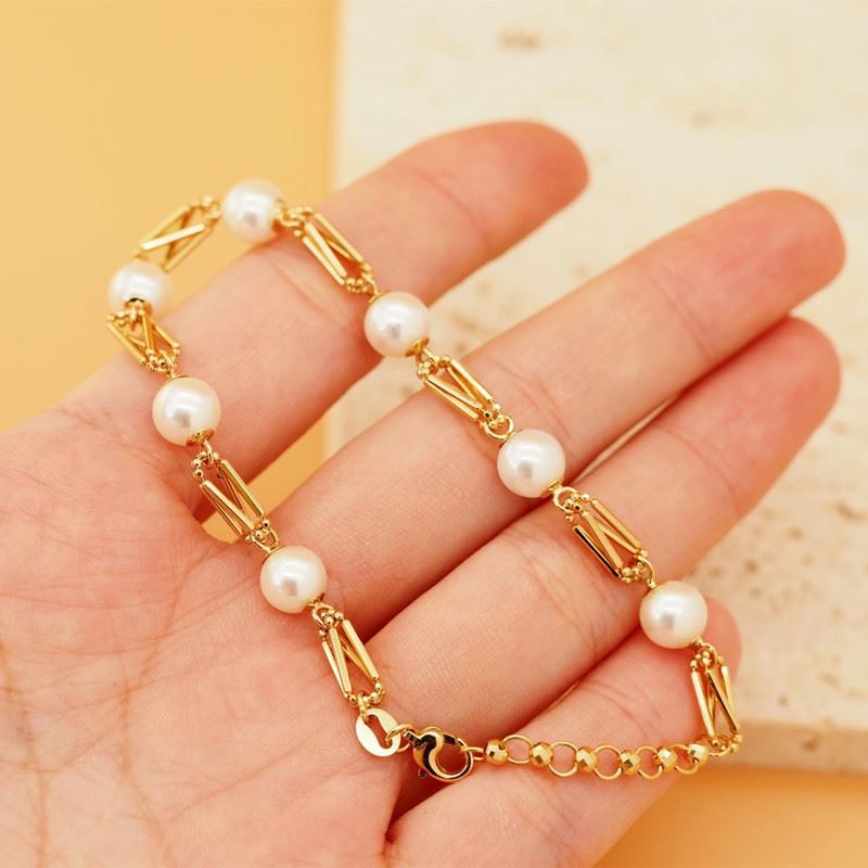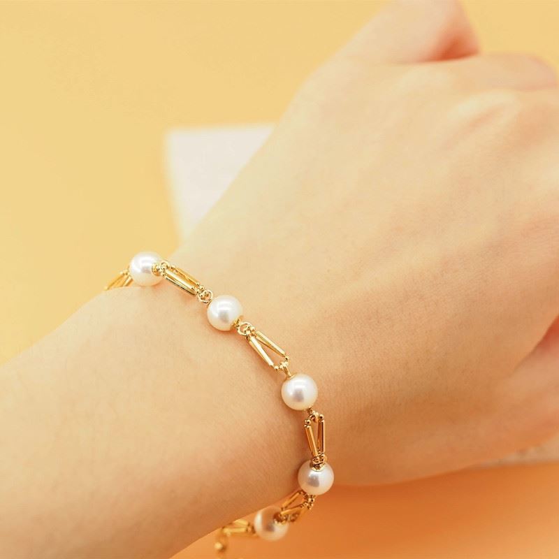 This 18K gold pearl bracelet combines the exquisite gold chain with rounded pearls, showcasing elegance and luxury. The alternating design of pearls and gold links exudes a noble charm and sophisticated taste. Suitable for various occasions, whether daily wear or special events, it will bring out the wearer's captivating charm.Total weight: 6.42g.Note: GUILD certificate, comes with a jewelry, gemstone, and precious metal authentication certificate.