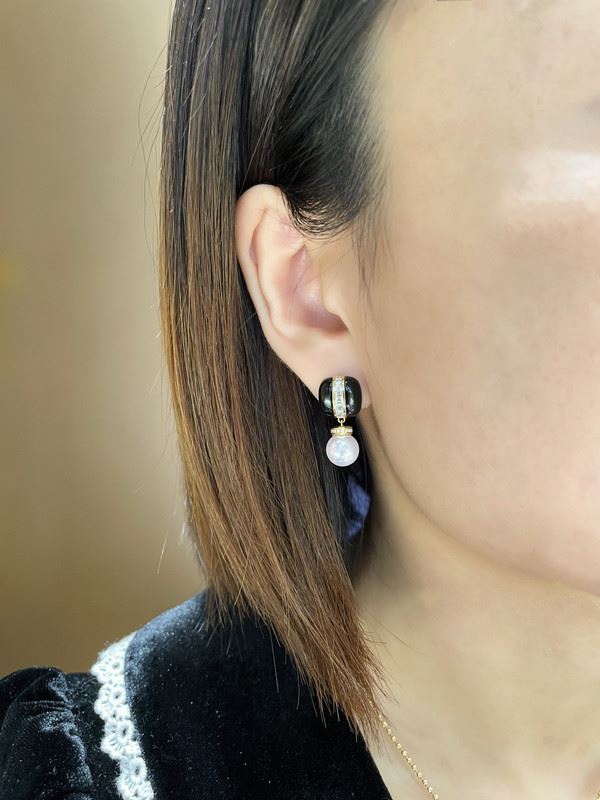 These 18K gold earrings feature black onyx and diamond accents at the top, paired with elegant pearls. The contrast between the lustrous pearls and the black onyx creates a unique and sophisticated look, perfect for both formal and casual occasions.Total weight: 6.63g.Note: GUILD certificate, comes with a jewelry, gemstone, and precious metal authentication certificate.