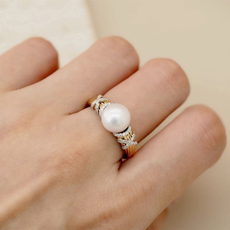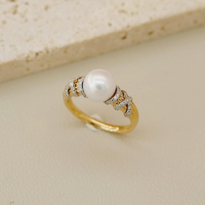 This 18K gold pearl ring features a lustrous pearl at the center, surrounded by delicate diamonds, offering an elegant and refined design. The textured gold band adds depth to the overall look, while the combination of the pearl and diamonds radiates sophistication and grace. Perfect for both everyday wear and special occasions, this ring enhances the wearer’s timeless elegance and luxury.Ring size: 6, circumference: 52 mm, diameter: 16.6 mm, total weight: 5.63g.Note: GUILD certificate, comes with a jewelry, gemstone, and precious metal authentication certificate.