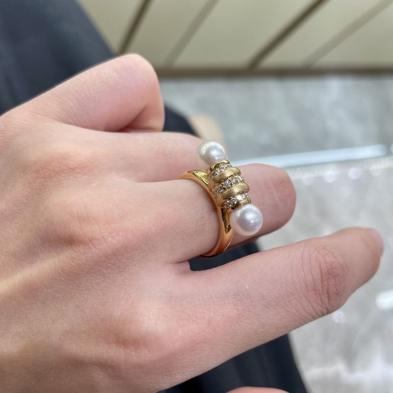This 18K gold ring features two high-quality pearls at its center, separated by delicate diamond accents that add a sparkling touch. The unique design blends the soft luster of the pearls with the brilliance of the diamonds, creating a sophisticated and luxurious piece.Ring size: 6, circumference: 52 mm, diameter: 16.6 mm, total weight: 5.96g.Note: GUILD certificate, comes with a jewelry, gemstone, and precious metal authentication certificate.