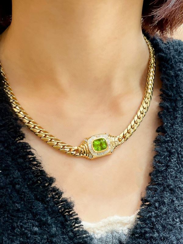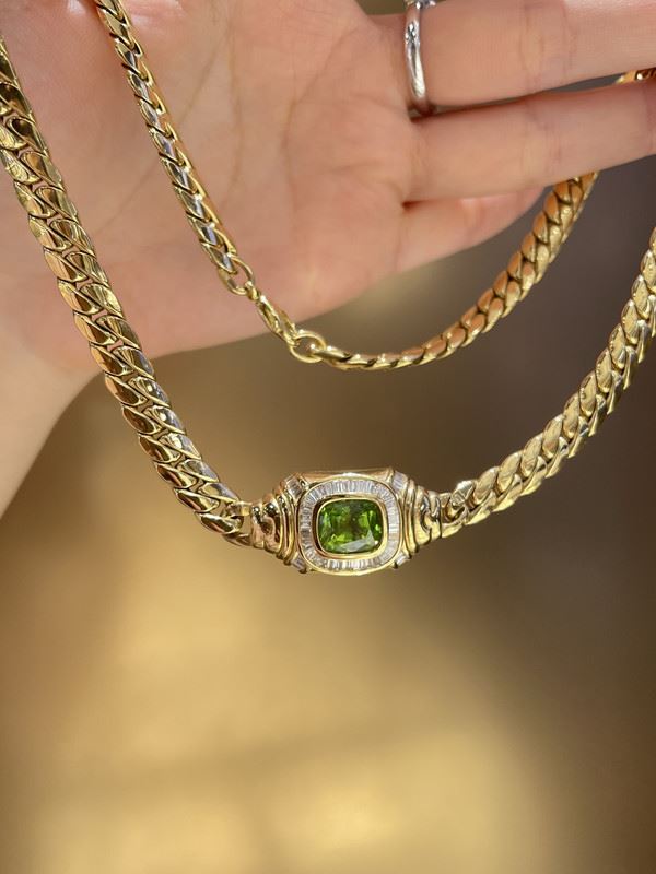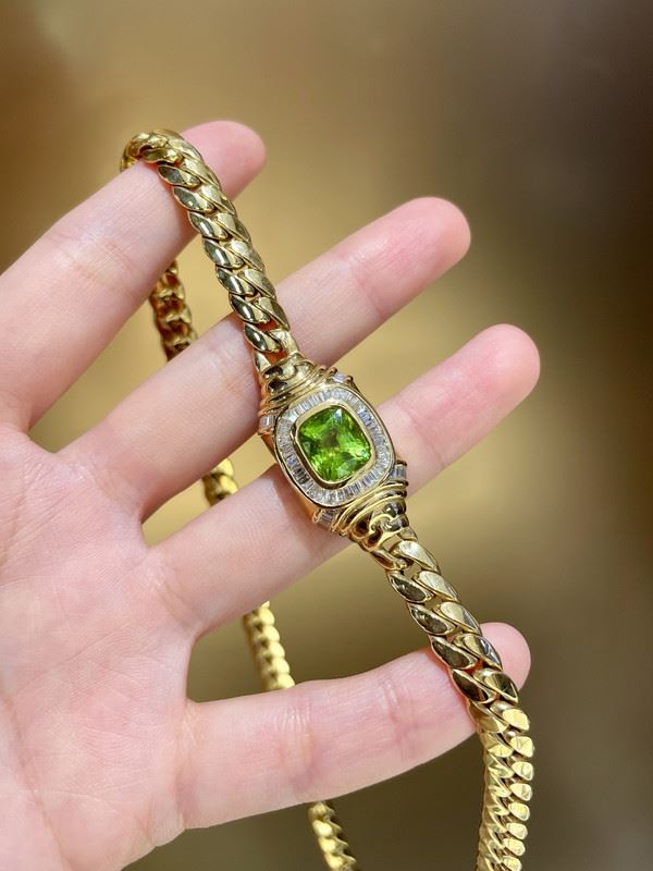 This 18K gold peridot Cuban link necklace blends the timeless Cuban chain with the brilliance of a vibrant peridot gemstone. The peridot is set in the center, radiating a green hue, while the delicate gold chain adds a luxurious touch. Whether paired with casual wear or evening attire, this necklace brings a distinctive glow to the wearer.Total weight: 23.11g.Note: GUILD certificate, comes with a jewelry, gemstone, and precious metal authentication certificate.