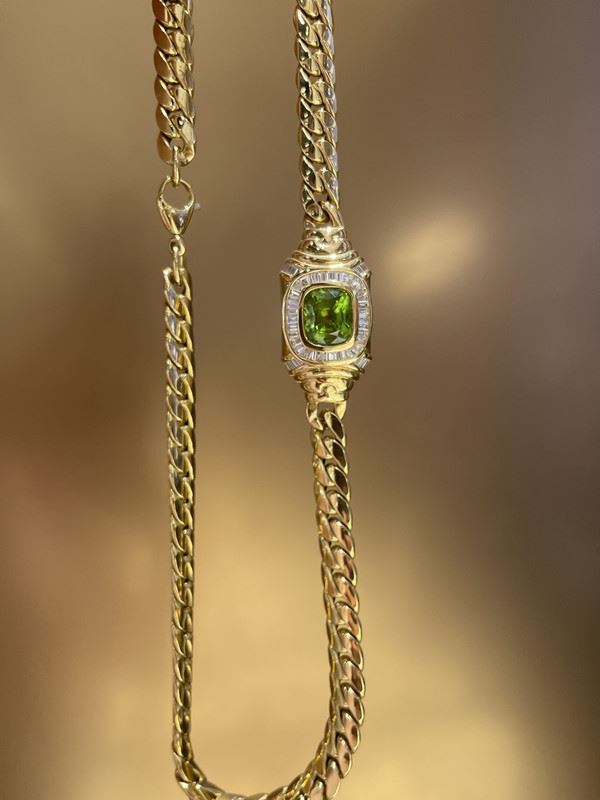 This 18K gold peridot Cuban link necklace blends the timeless Cuban chain with the brilliance of a vibrant peridot gemstone. The peridot is set in the center, radiating a green hue, while the delicate gold chain adds a luxurious touch. Whether paired with casual wear or evening attire, this necklace brings a distinctive glow to the wearer.Total weight: 23.11g.Note: GUILD certificate, comes with a jewelry, gemstone, and precious metal authentication certificate.