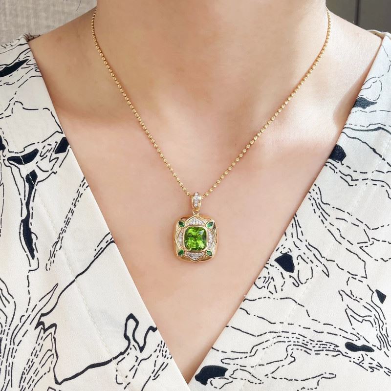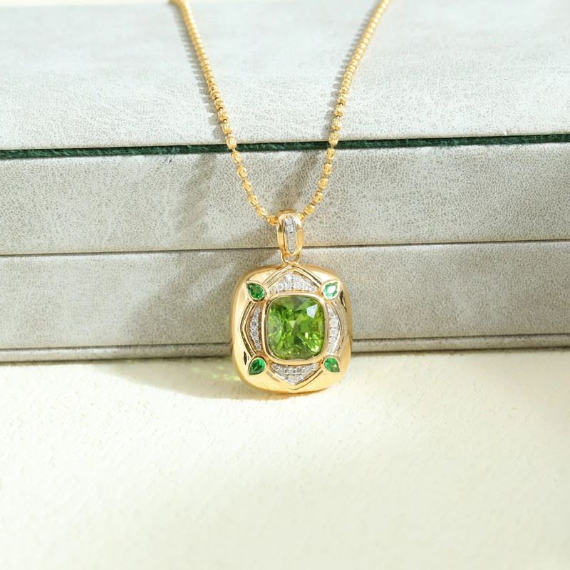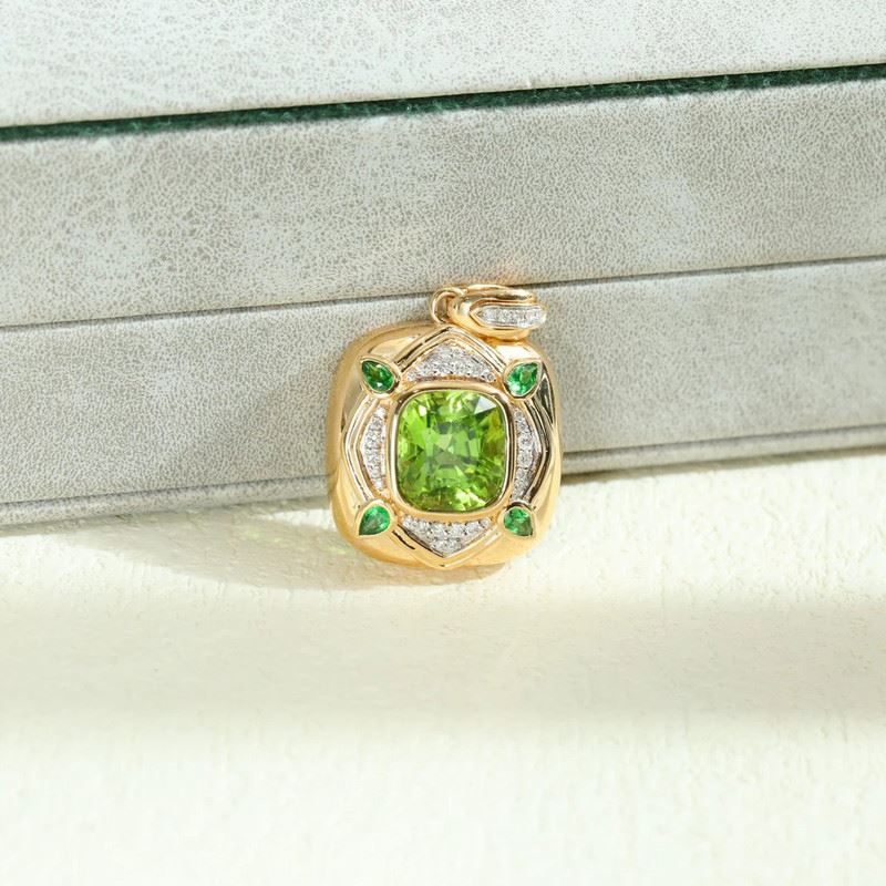 This 18K gold pendant features a vivid peridot at its center, accented with green gemstones and diamonds at the corners. The refreshing green hue of the peridot contrasts beautifully with the golden glow, radiating a refined balance of nature and luxury.Total weight: 6.46g.Note: GUILD certificate, comes with a jewelry, gemstone, and precious metal authentication certificate.
