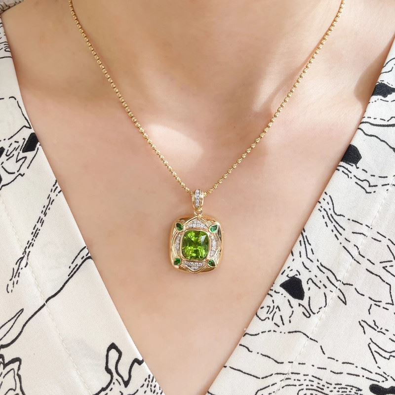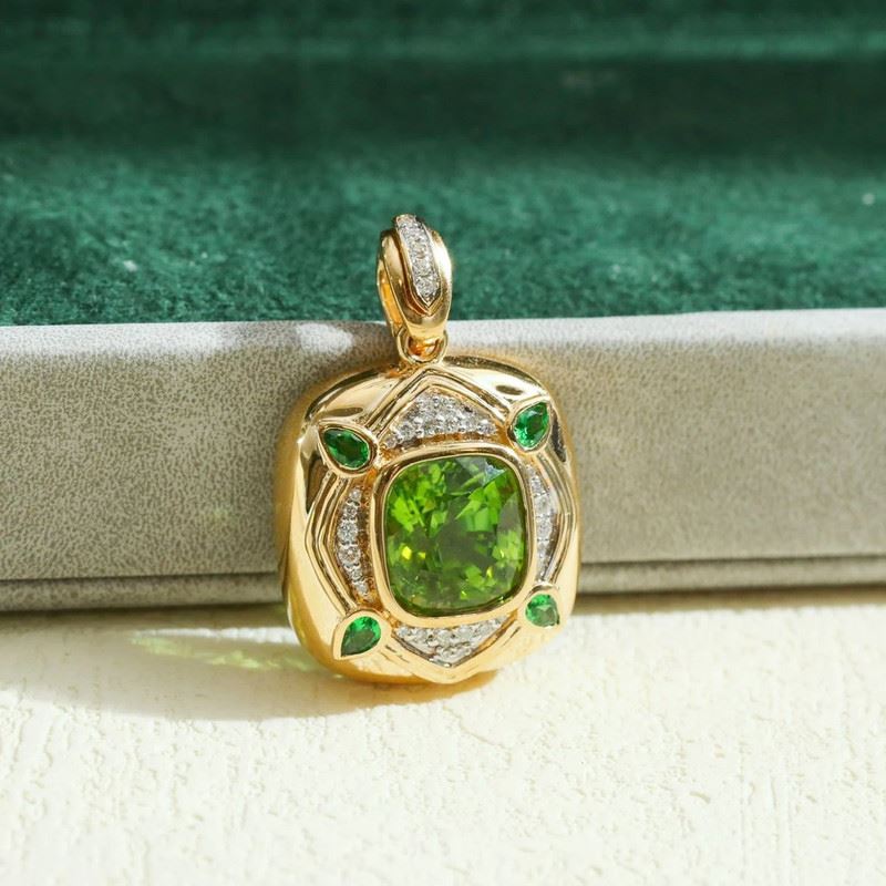 This 18K gold pendant features a vivid peridot at its center, accented with green gemstones and diamonds at the corners. The refreshing green hue of the peridot contrasts beautifully with the golden glow, radiating a refined balance of nature and luxury.Total weight: 6.46g.Note: GUILD certificate, comes with a jewelry, gemstone, and precious metal authentication certificate.