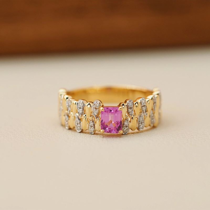 This 18K gold pink sapphire ring features a delicate pink sapphire at the center, surrounded by sparkling diamonds, creating a perfect blend of elegance and luxury. The golden hue complements the fresh color of the pink sapphire, while the diamond accents add a dazzling touch to the design. A refined piece, perfect for any occasion.Ring size: 6.5, circumference: 53 mm, diameter: 17 mm, total weight: 4.54 g.