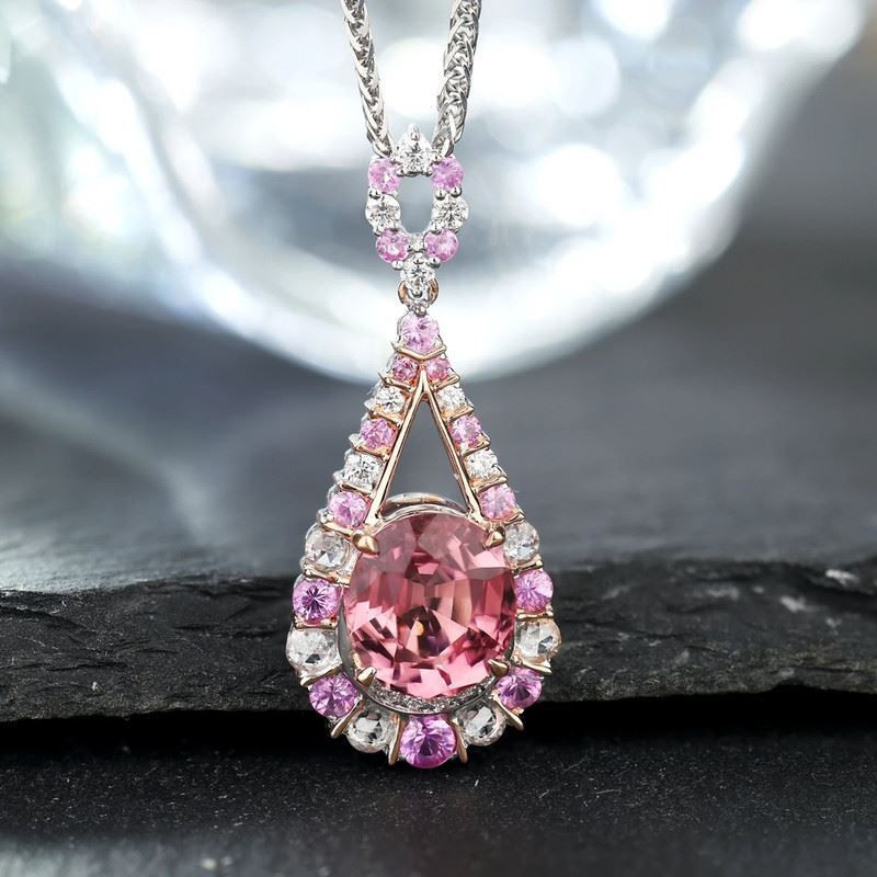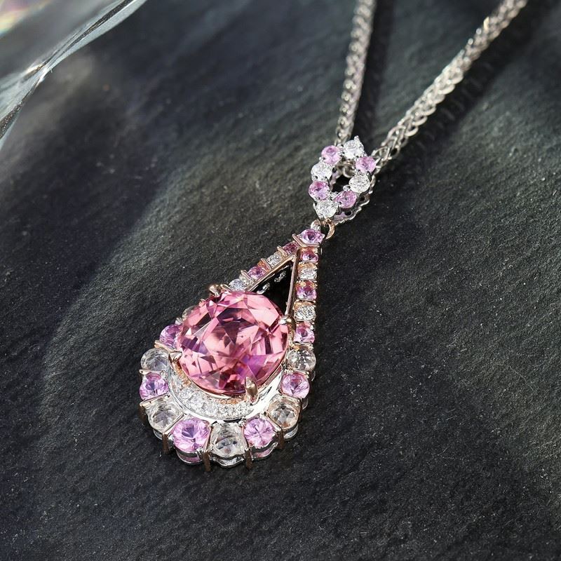 This 18K gold pendant features a pear-shaped pink tourmaline surrounded by alternating pink and white diamonds. The harmonious layering and gentle hue of the gemstone exude a romantic and graceful charm.Total weight: 3.56g.
