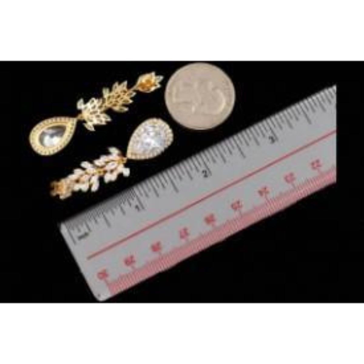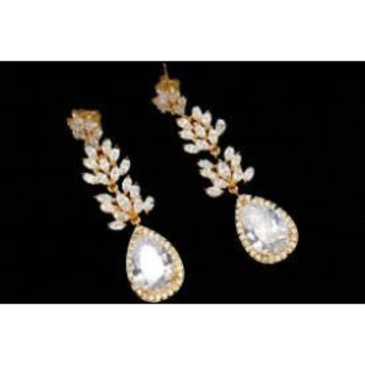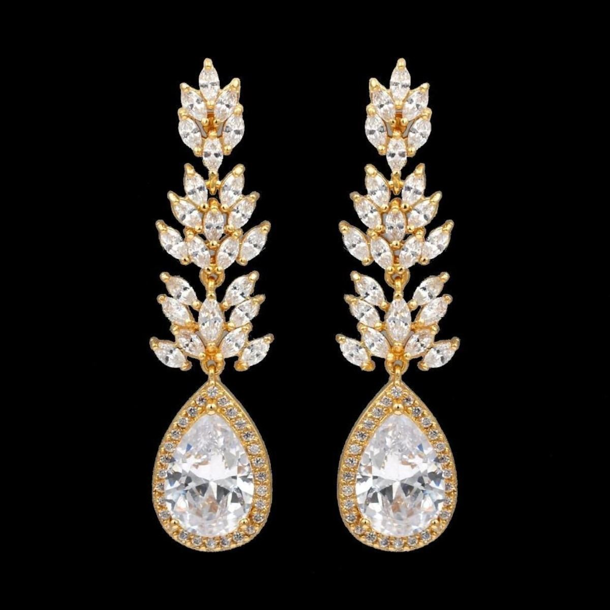 Type: Pierced earrings. Stone: Inlaid AAA grade high quality cubic zirconia. Stone color: Clear. Main stone size: Pear CZ 13 * 9 mm. Metal: 18k gold plated copper triple thickness. Length: 2". Weight: One earring is 0.19 oz. Quantity: 1 pair