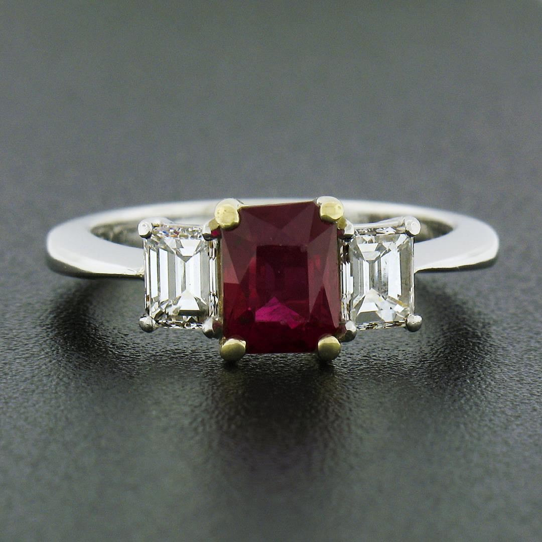 A solid platinum & 18k yellow gold ring, with 1 GIA graded rectangular cut natural Burma ruby (1.50ct ), and 2 emerald cut natural diamonds (G/H - VS1/VS2 ; 0.65ctw). The ring is size 6.0, weighs a total of 5.60 grams, and measures 7.3mm wide. Comes with all original relevant certifications.