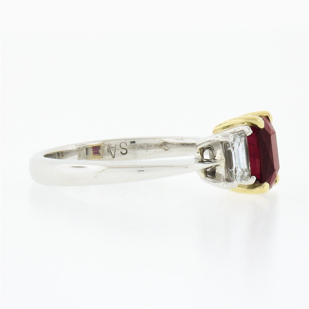 A solid platinum & 18k yellow gold ring, with 1 GIA graded rectangular cut natural Burma ruby (1.50ct ), and 2 emerald cut natural diamonds (G/H - VS1/VS2 ; 0.65ctw). The ring is size 6.0, weighs a total of 5.60 grams, and measures 7.3mm wide. Comes with all original relevant certifications.