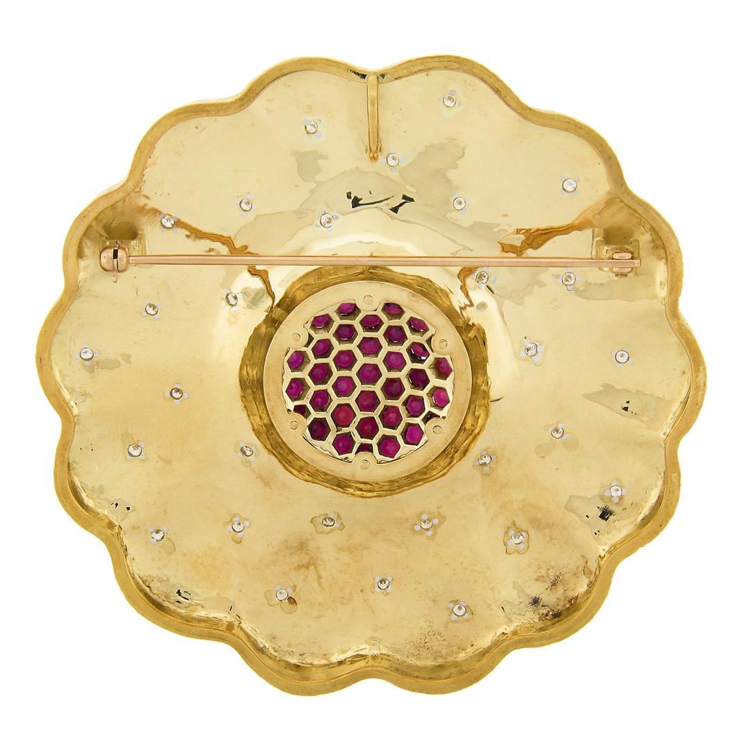 a solid 18k yellow gold & platinum large flower pendant brooch, with 29 round cut natural diamonds (G/H - VS1-VS2 ; 1.10ctw ), and 37 round cut natural rubies (7+ctw). Measures 77.4mm in diameter and weighs a total of 60.15 grams, inside bail measurements 9x5.3mm.