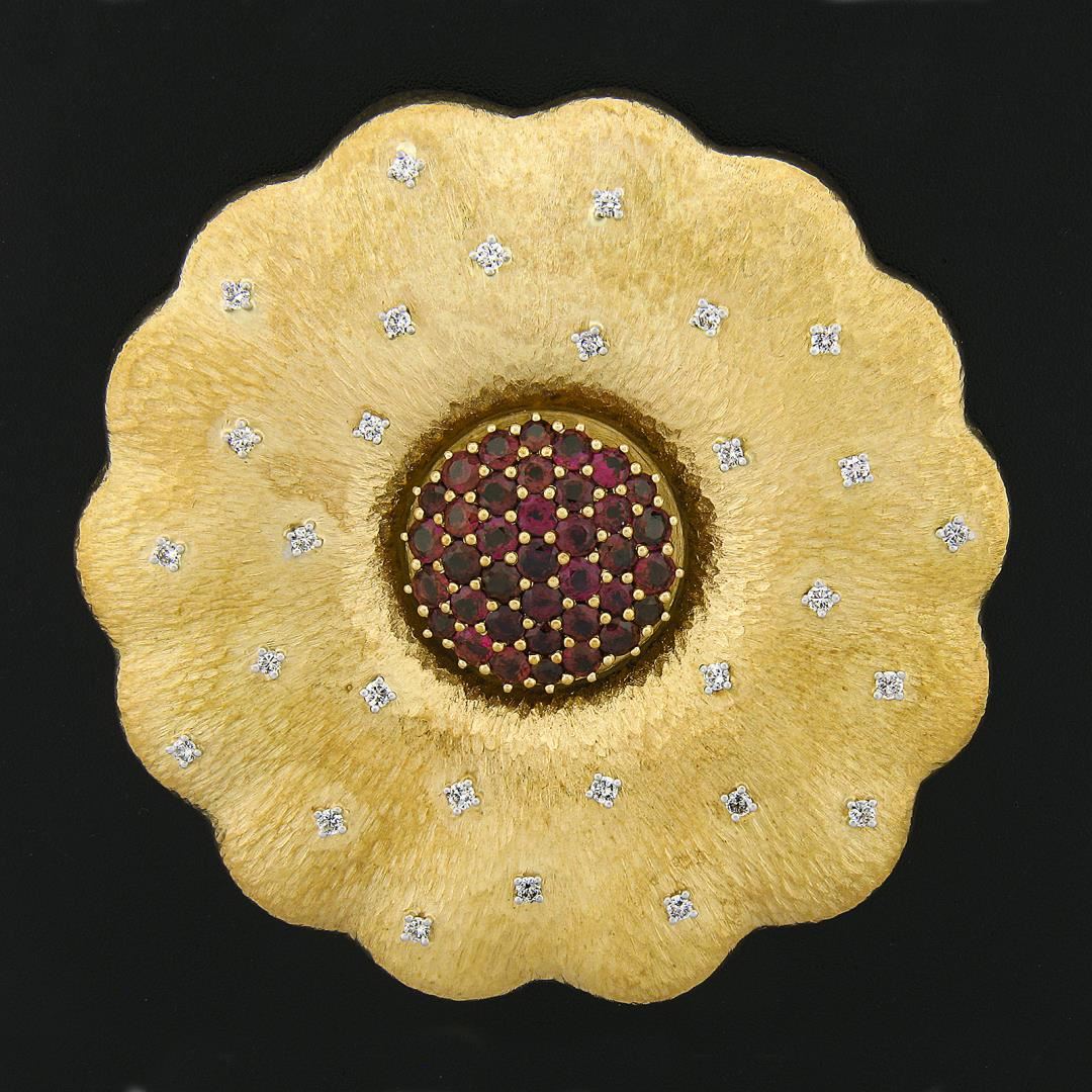 a solid 18k yellow gold & platinum large flower pendant brooch, with 29 round cut natural diamonds (G/H - VS1-VS2 ; 1.10ctw ), and 37 round cut natural rubies (7+ctw). Measures 77.4mm in diameter and weighs a total of 60.15 grams, inside bail measurements 9x5.3mm.