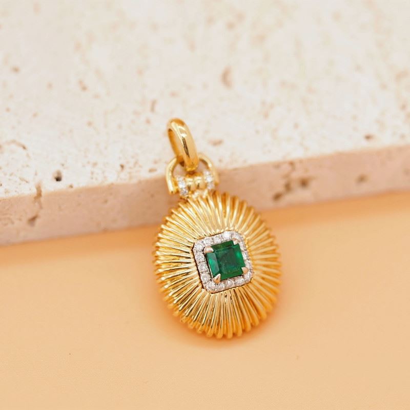 This 18K gold pendant features a square-cut emerald at its center, surrounded by radiant gold textures and accented with diamonds. The vivid green of the emerald contrasts beautifully with the warm golden sheen, embodying both elegance and vitality.Size: 15*25mm, total weight: 6g.