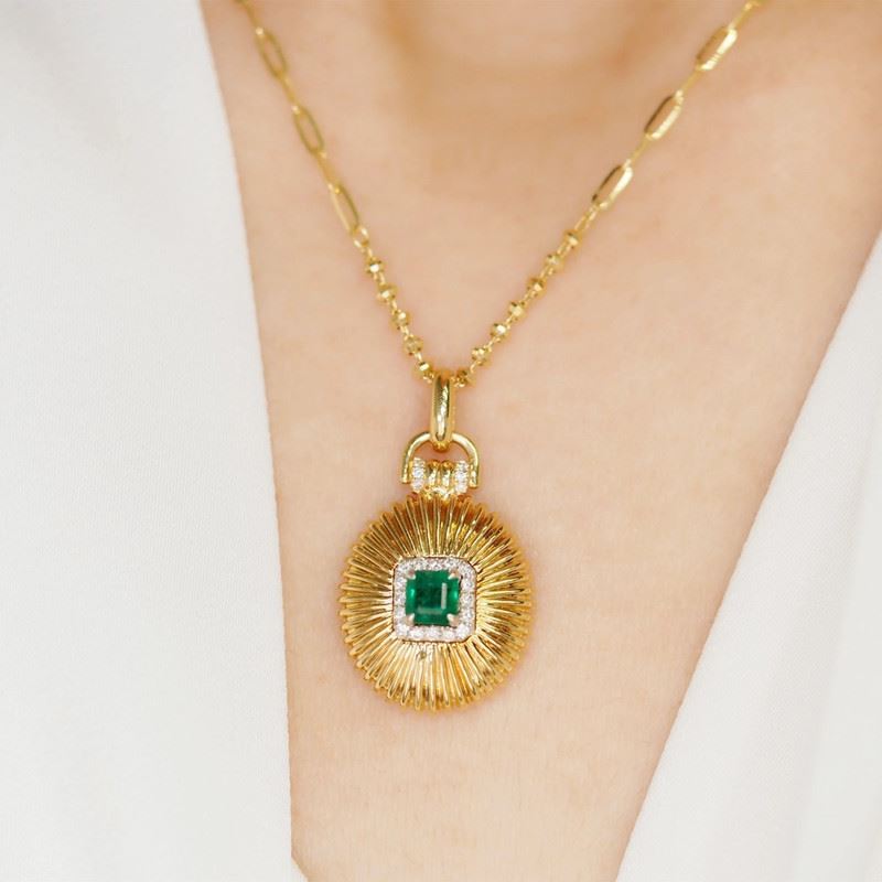 This 18K gold pendant features a square-cut emerald at its center, surrounded by radiant gold textures and accented with diamonds. The vivid green of the emerald contrasts beautifully with the warm golden sheen, embodying both elegance and vitality.Total weight: 6g.Note: GUILD certificate, comes with a jewelry, gemstone, and precious metal authentication certificate.