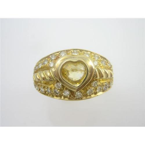 If you bought this 18k Gold Designer ring in a Retail Store you wou ld pay $2,500 for it, plus the Sales Tax! It is an 18k Yellow Gold Designer ring featuring a Heartshaped YELLOW Sapphire = .75 CARATS! This Yellow Sapphire is surrounded by 32 'sparkling' Diamonds. The Diamond Total Weight = .64 CARATS! This ring is a size 7 1/2 and I can resize it. It is in Mint condition - and I HIGHLY recommend it to you!!