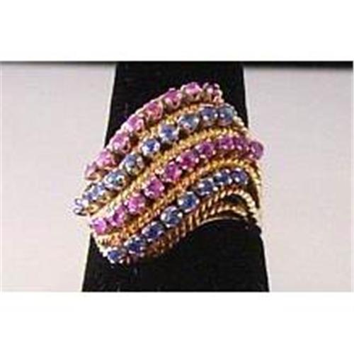 Circa. 1950. 18k yellow gold tested with 18k acid. 18 natural red rubies, single cuts, with total approximate weight of .50 carats. 18 natural blue sapphires with total approximate weight of .50 carats. Marked "750" Size 7 1/4. Can be easily sized by a jeweler. In pristine original condition.