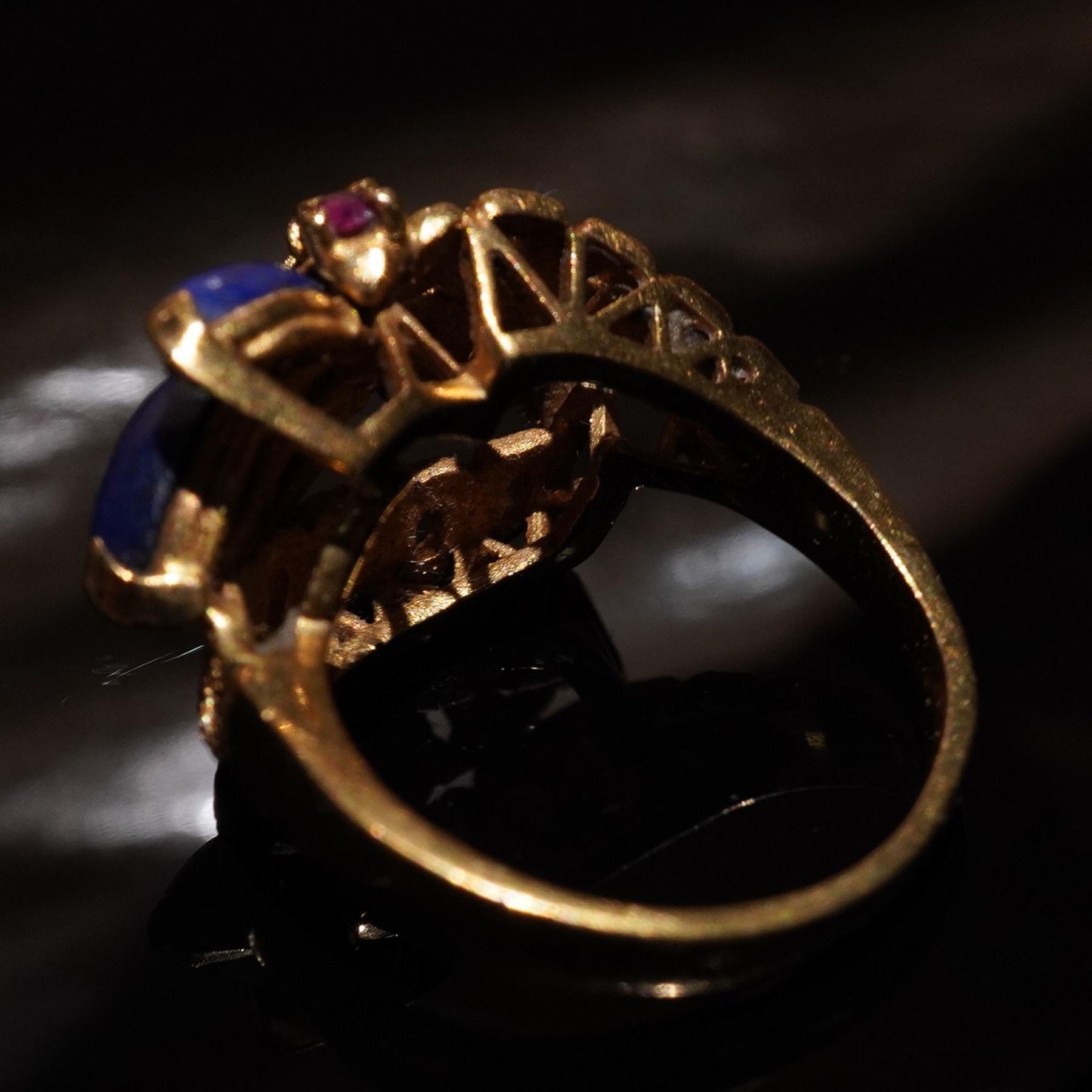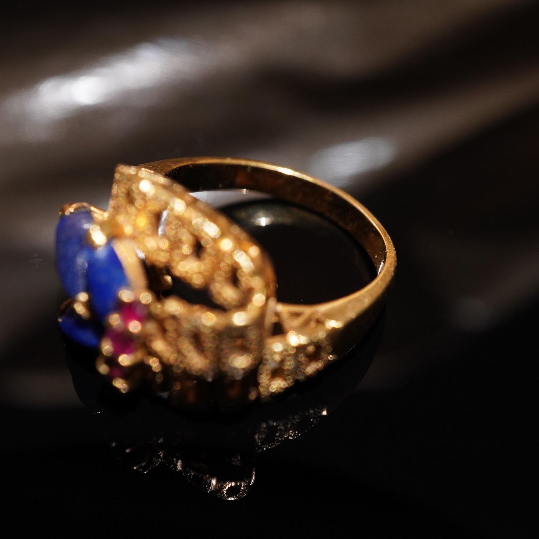 Striking 18K yellow gold ring featuring a cluster of vibrant pink rubies paired with deep blue marquise-shaped stones arranged in a floral-inspired design. The textured gold setting and decorative band add visual interest and dimension. Total weight with stones: 6.4 grams. Approximately ring size 5.5. A bold statement piece showcasing vivid color and intricate craftsmanship.