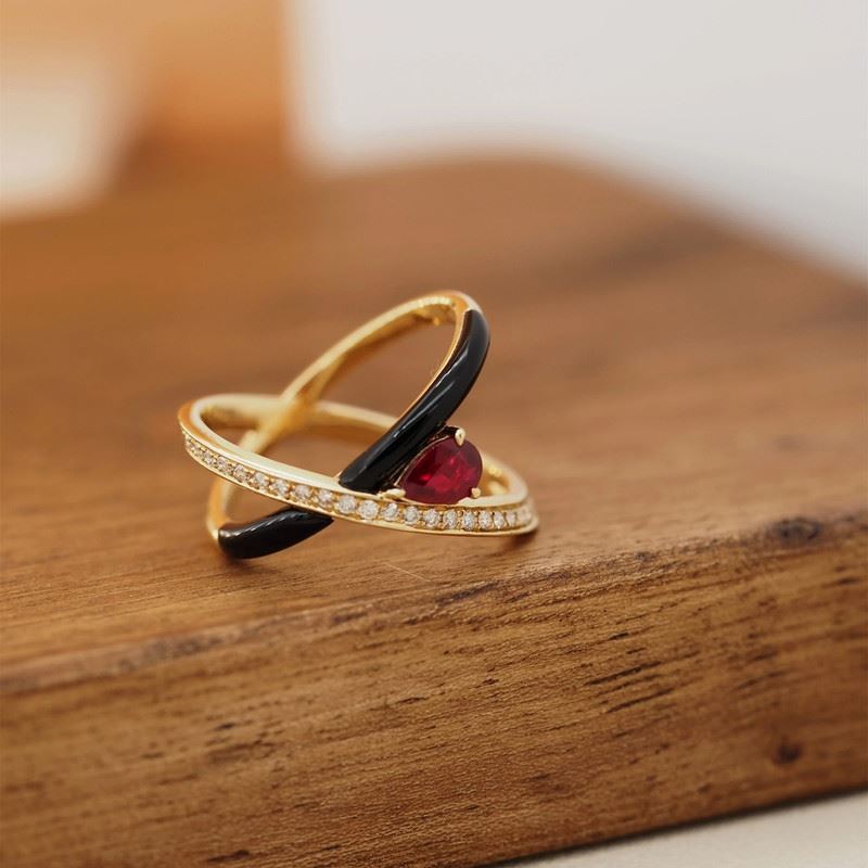 This 18K gold ruby ring features a unique crossover design, with a delicate ruby at the center and diamonds set along one band, complemented by black enamel. The gold and deep red hues of the ruby create a luxurious and elegant piece, perfect for any occasion and adding a regal touch to the wearer.Ring size: 6, circumference: 52 mm, diameter: 16.6 mm, total weight: 4.43g.Note: GUILD certificate, comes with a jewelry, gemstone, and precious metal authentication certificate.