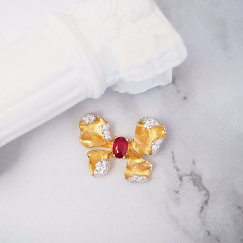 This 18K gold pendant features a floral motif centered with a vivid ruby and accented by diamond-studded petals. The warm golden tone enhances its radiant beauty, while the ruby’s fiery hue symbolizes passion and strength, embodying timeless elegance.Total weight: 3.51g.Note: GUILD certificate, comes with a jewelry, gemstone, and precious metal authentication certificate.