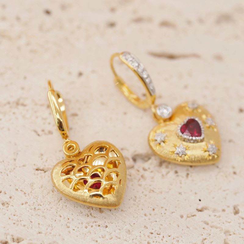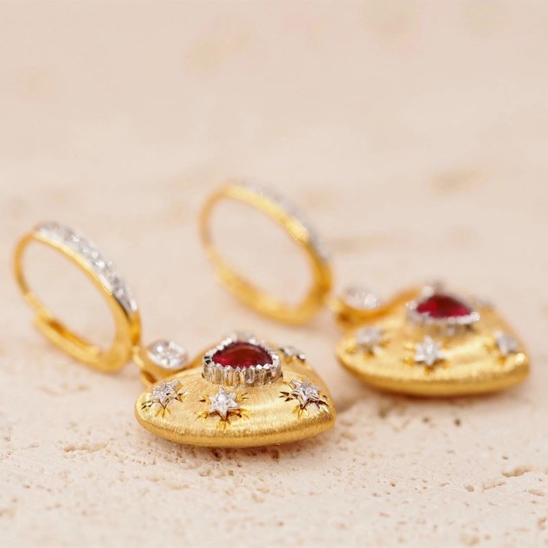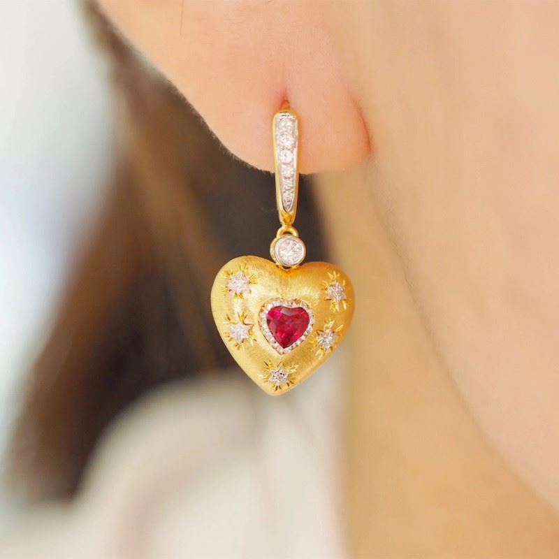Crafted from 18K gold and ruby, these earrings feature a heart-shaped design exuding a strong sense of romance, symbolizing love and passion. The surrounding diamonds sparkle like stars, adding to its luxurious feel. Perfect for dates or special occasions, these earrings add a touch of romance and elegance.Total weight: 6.36g.Note: GUILD certificate, comes with a jewelry, gemstone, and precious metal authentication certificate.