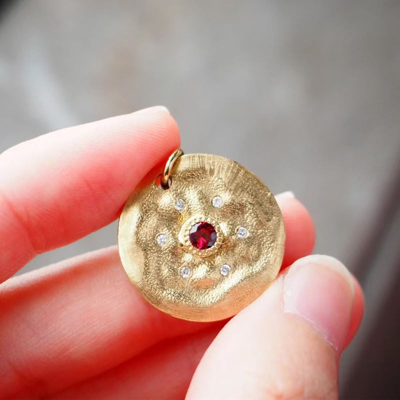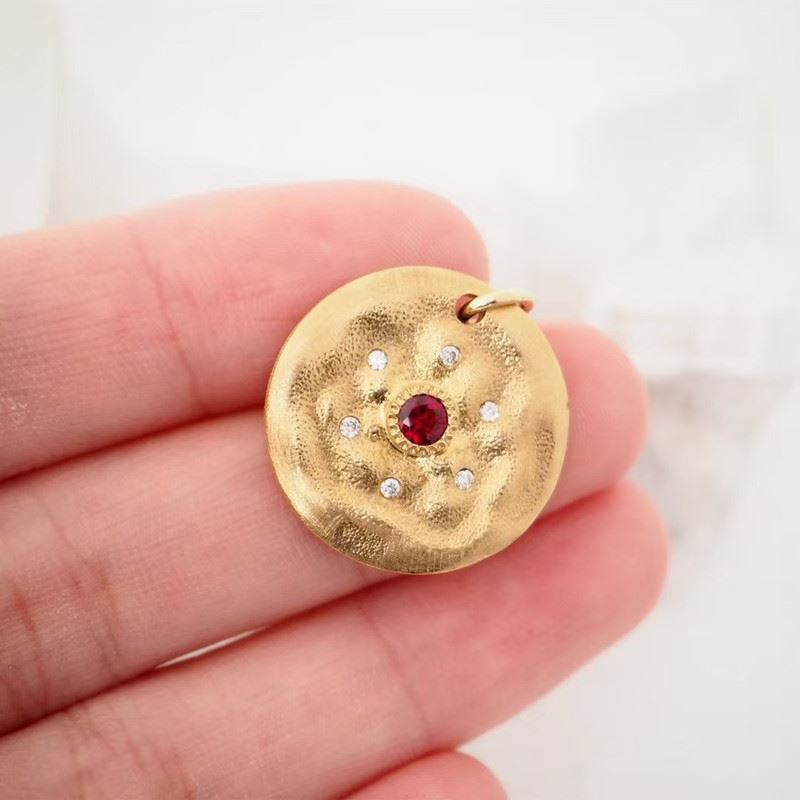 This 18K gold pendant features a circular medallion design centered with a ruby surrounded by delicate diamonds. The hammered gold texture adds a refined artisanal touch, while the ruby’s vivid hue radiates warmth and timeless elegance.Total weight: 6.43g.Note: GUILD certificate, comes with a jewelry, gemstone, and precious metal authentication certificate.