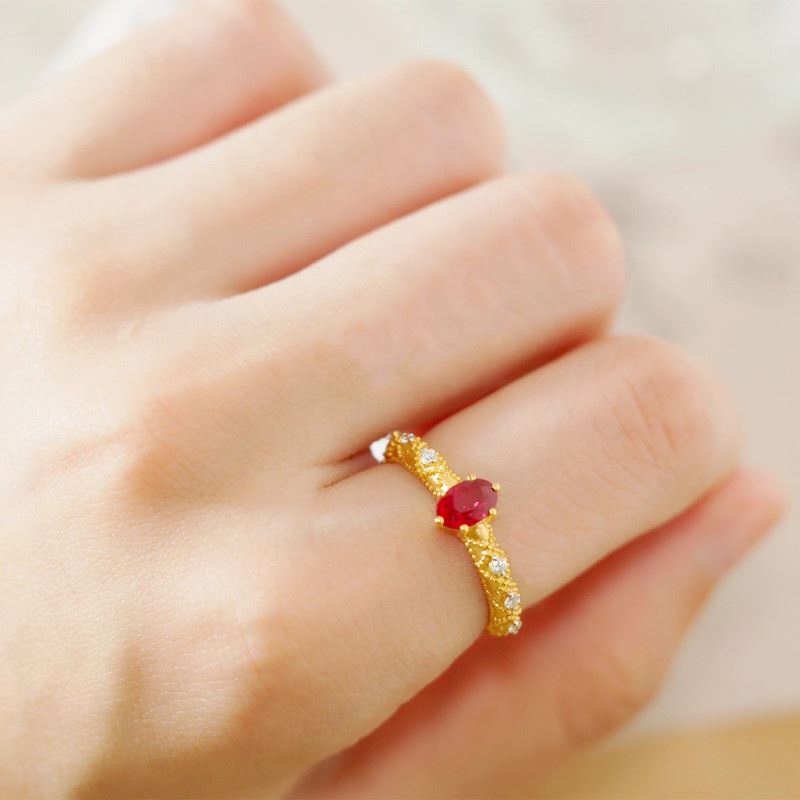 This 18K gold ruby ring features a stunning ruby at the center, surrounded by sparkling diamonds, blending elegance and luxury. The woven texture of the golden band complements the gemstones, adding depth and refinement to the design. Ideal for both everyday wear and special occasions, this ring adds a touch of nobility and grace to the wearer.Ring size: 6, circumference: 52 mm, diameter: 16.6 mm, total weight: 2.73g.Note: GUILD certificate, comes with a jewelry, gemstone, and precious metal authentication certificate.