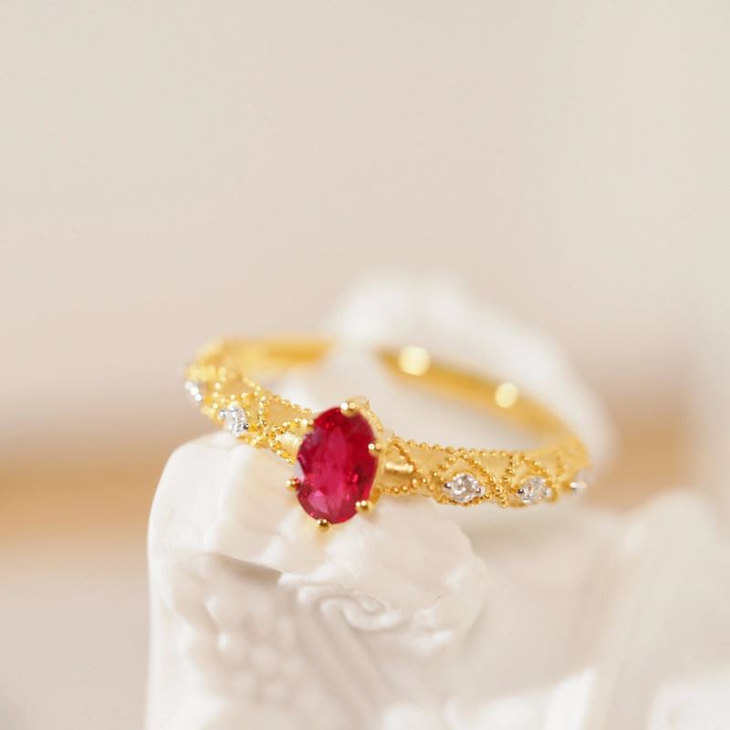 This 18K gold ruby ring features a stunning ruby at the center, surrounded by sparkling diamonds, blending elegance and luxury. The woven texture of the golden band complements the gemstones, adding depth and refinement to the design. Ideal for both everyday wear and special occasions, this ring adds a touch of nobility and grace to the wearer.Ring size: 6, circumference: 52 mm, diameter: 16.6 mm, total weight: 2.73g.Note: GUILD certificate, comes with a jewelry, gemstone, and precious metal authentication certificate.
