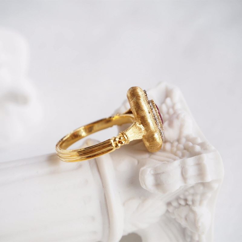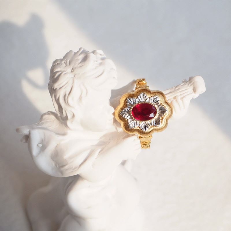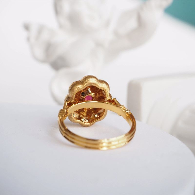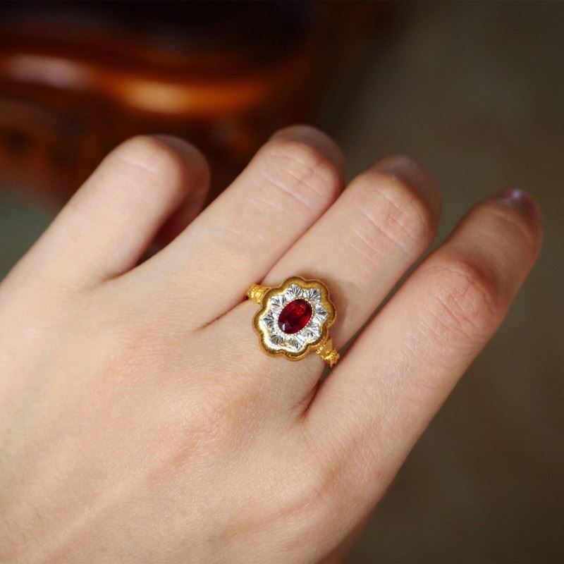 This elegant 18K gold ring features a stunning oval ruby at its center, surrounded by dazzling diamonds that form a beautiful floral design. The intricate gold band adds a touch of luxury and sophistication, making it an exquisite choice for any special occasion.Ring size: 6, circumference: 52 mm, diameter: 16.6 mm, total weight: 4.86g.Note: GUILD certificate, comes with a jewelry, gemstone, and precious metal authentication certificate.