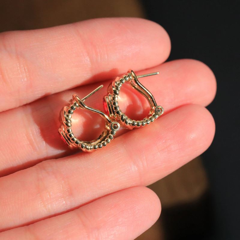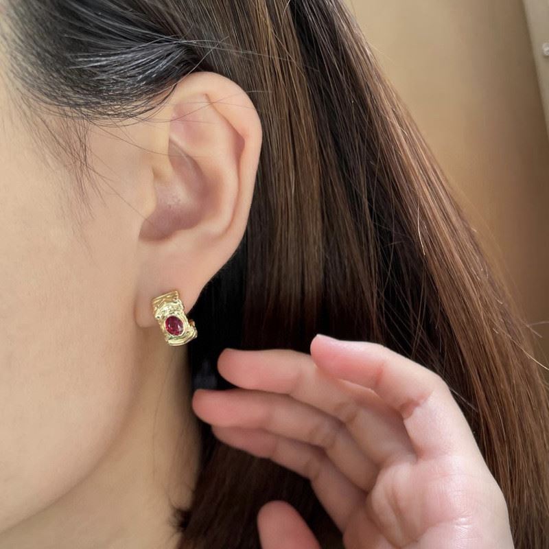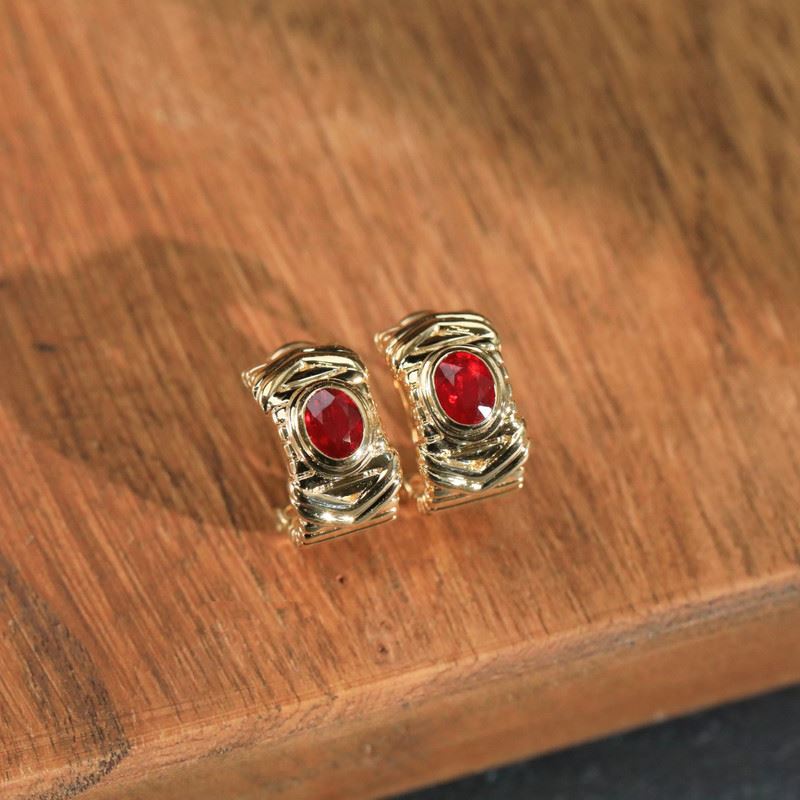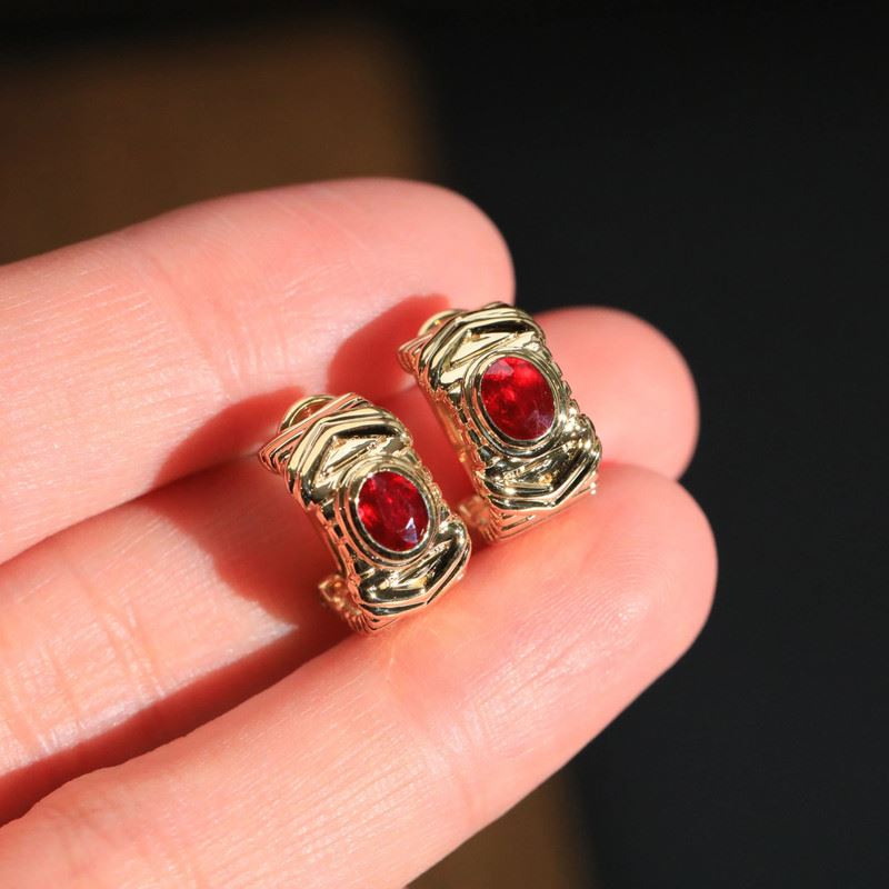 These 18K gold stud earrings feature oval-shaped rubies at the center, surrounded by intricate gold detailing. The deep red of the rubies complements the gold’s radiant glow, creating a look of timeless elegance and sophistication, perfect for any occasion.Total weight: 5.53g.Note: GUILD certificate, comes with a jewelry, gemstone, and precious metal authentication certificate.