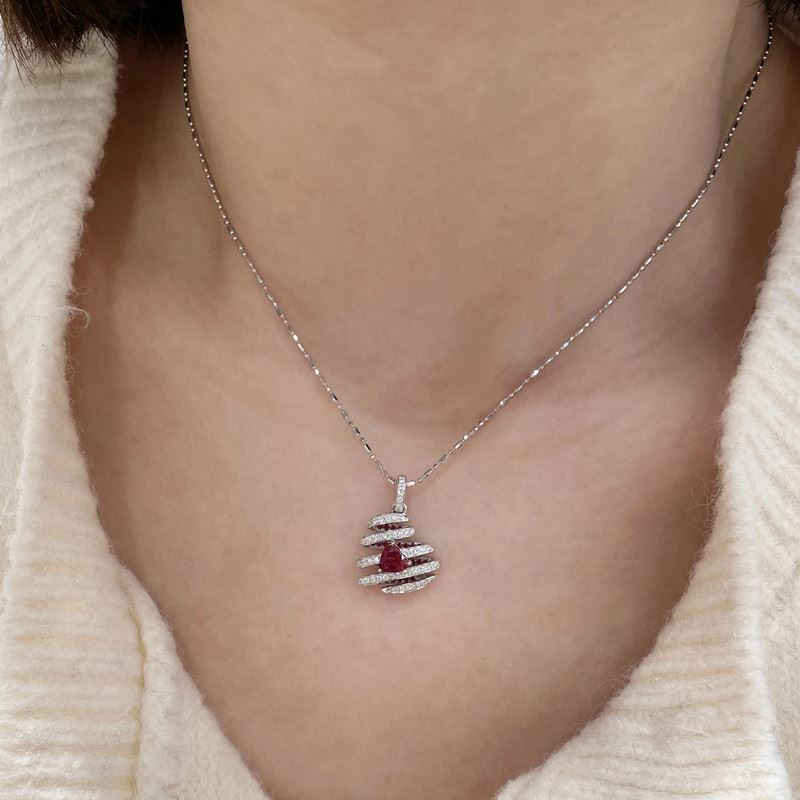 This 18K gold pendant features a heart-shaped ruby at the center, encircled by flowing layers of diamonds. The vivid red and sparkling white create a striking contrast, embodying both romance and sophistication.Total weight: 3.02g.Note: GUILD certificate, comes with a jewelry, gemstone, and precious metal authentication certificate.