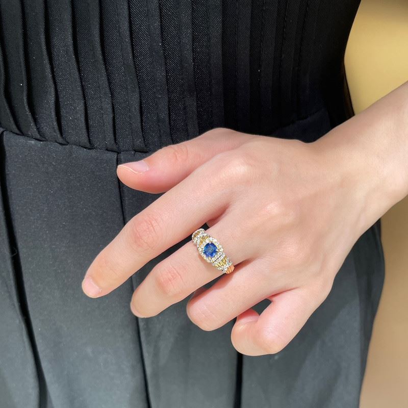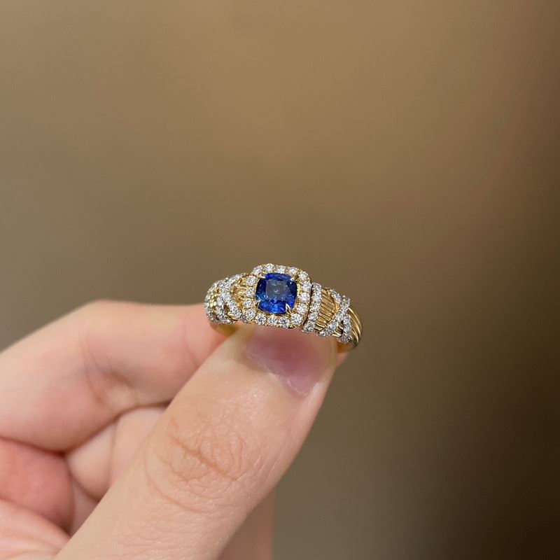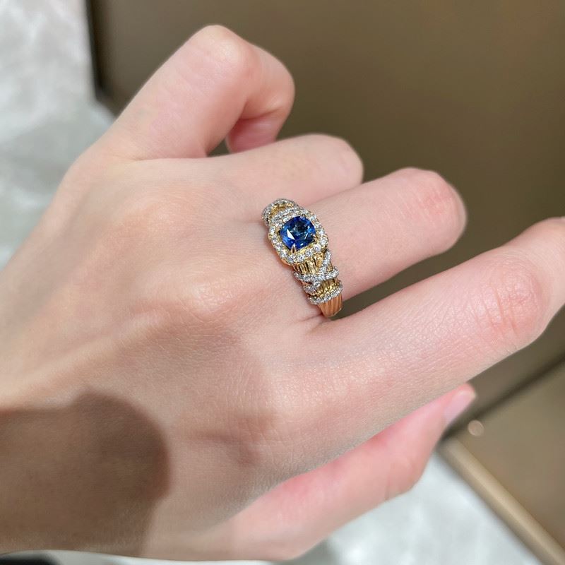 This 18K gold ring features a deep blue sapphire at its center, surrounded by sparkling diamonds. The intricate metalwork creates elegant curves, and the luxurious design exudes grandeur. The rich color of the sapphire perfectly complements the brilliance of the diamonds, radiating a noble and graceful aura.Ring size: 6, circumference: 52 mm, diameter: 16.6 mm, total weight: 6.29g.Note: GUILD certificate, comes with a jewelry, gemstone, and precious metal authentication certificate.