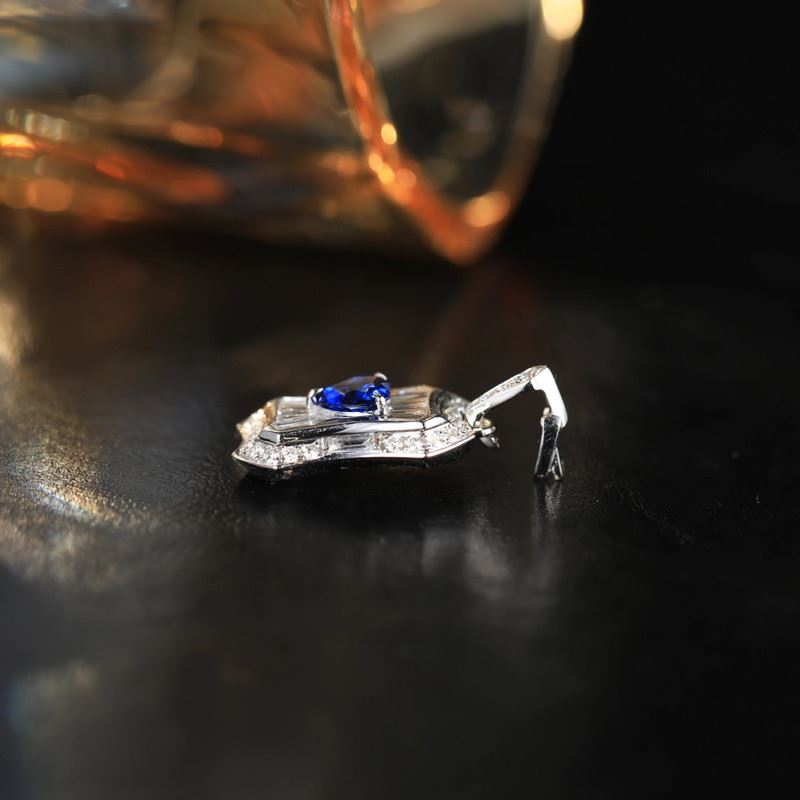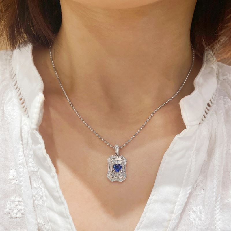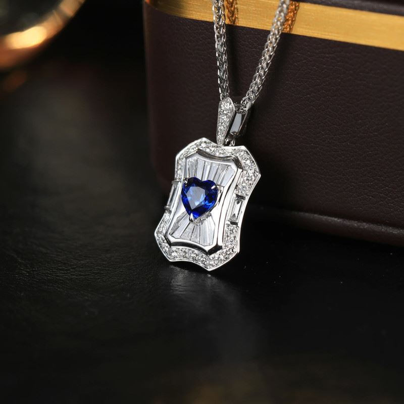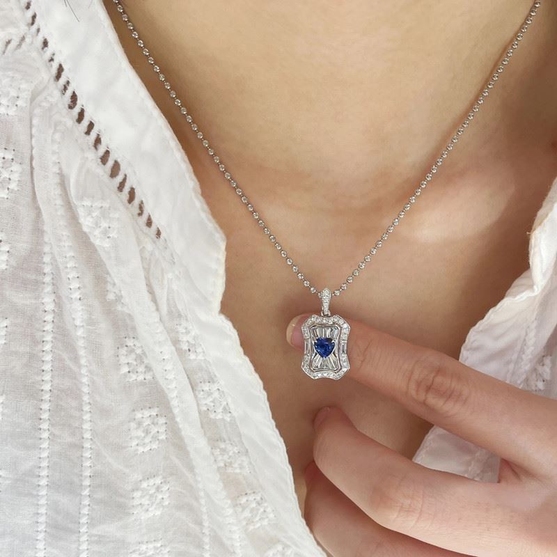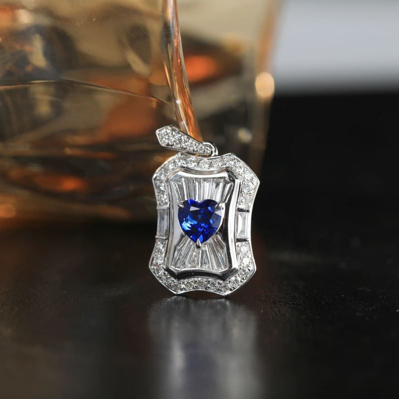 This 18K gold pendant features a heart-shaped sapphire surrounded by radiating baguette and round-cut diamonds. The interplay of light and structure enhances the sapphire’s deep blue brilliance, exuding timeless elegance and luxury.Total weight: 3.53g.Note: GUILD certificate, comes with a jewelry, gemstone, and precious metal authentication certificate.